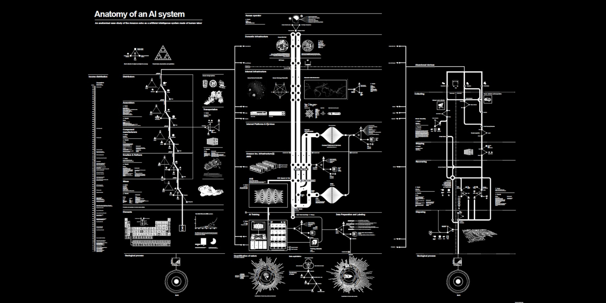 In the 21st century, we are seeing a new kind of mining for raw materials that drills deep into the biosphere. This enables AI technologies that are having a profound effect on the cognitive and affective layers of human nature. The resources for producing systems such as Amazon Echo, a speech controlled, Internet-based personal assistant, go beyond the technical aspects of data modelling, hardware, servers, and networks and extend much further into the realms of work, capital, and nature. The true costs – social, ecological, economic, and political – remain mostly hidden. Anatomy of an AI uses the example of Amazon Echo to show the countless components and factors behind the production of artificial intelligence systems. But this process is so complex that its full extent can hardly be comprehended.