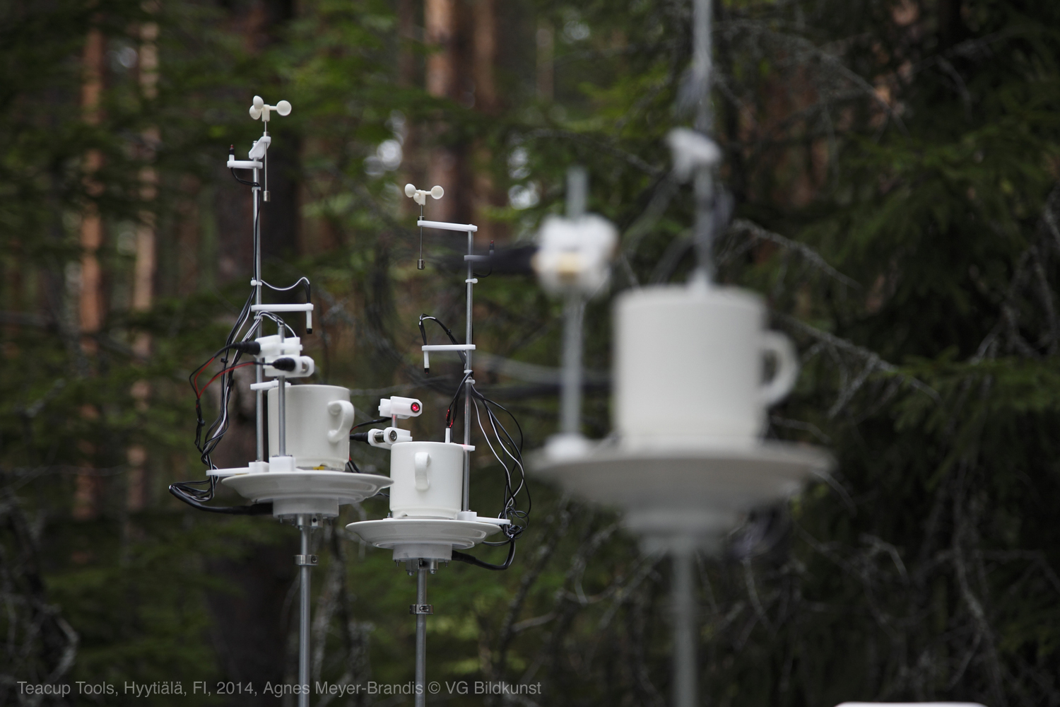 Agnes Mayer Brandis’s Teacup Tools are part of a “Global Teacup Network” and draw attention to climate-related sciences. Her work consists of a table and machinery for raising two or more teacups individually. Various measuring instruments are built in and onto the teacups, measuring the environment of the cup. The energy produced by these instruments heats the inside of the cups and brews tea from rainwater and the residues that have fallen into it. This tea produces a little cloud that contains the essence of the local air. The cloud again feeds back into the system and becomes the subject of investigation for the tools connected to the cup. The teacups move up and down individually, according to certain aspects related to the collected data and environmental processes, dancing an endless choreography determined by raindrops and clouds, particles, measurements, and tea drinking.