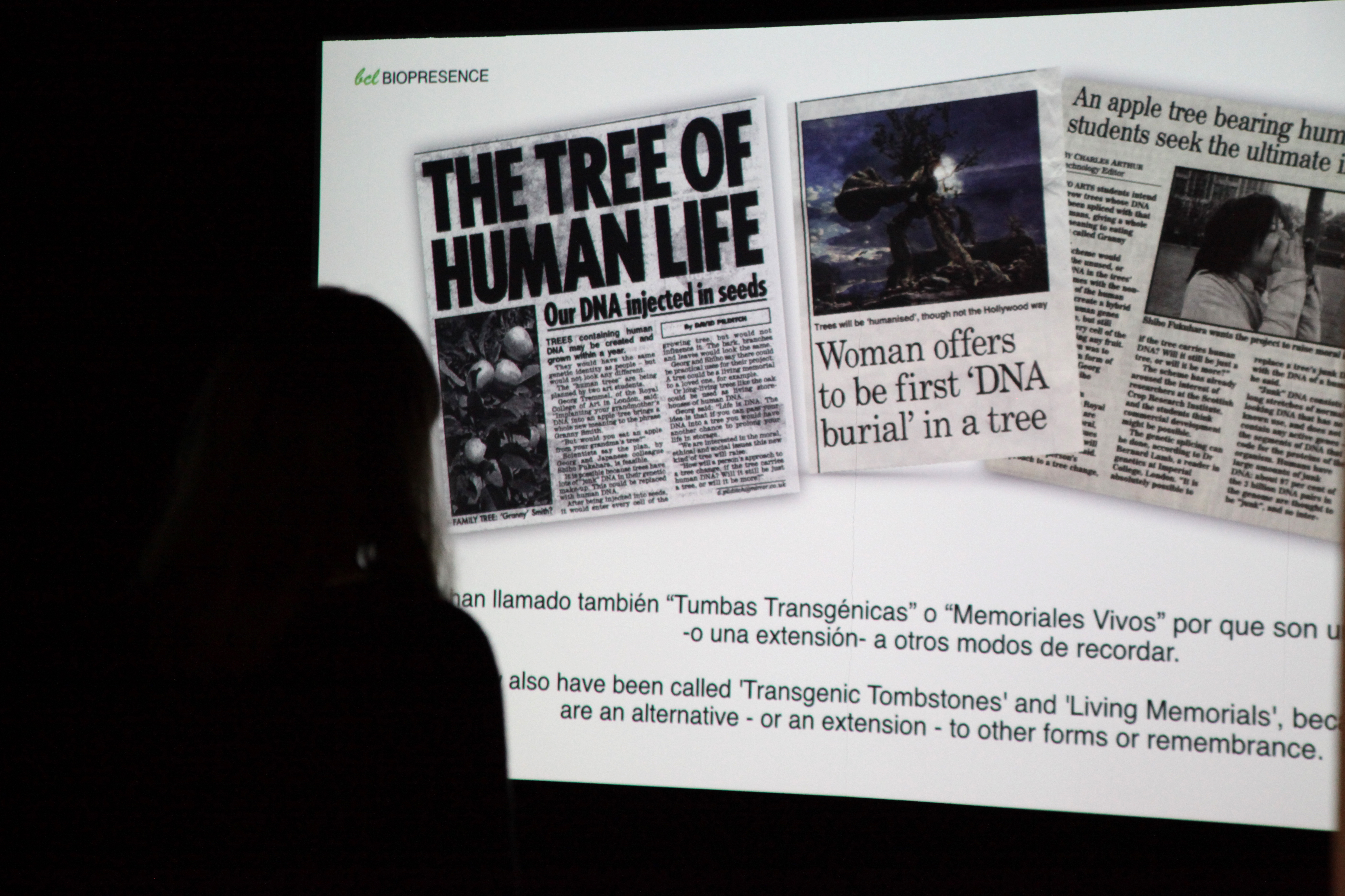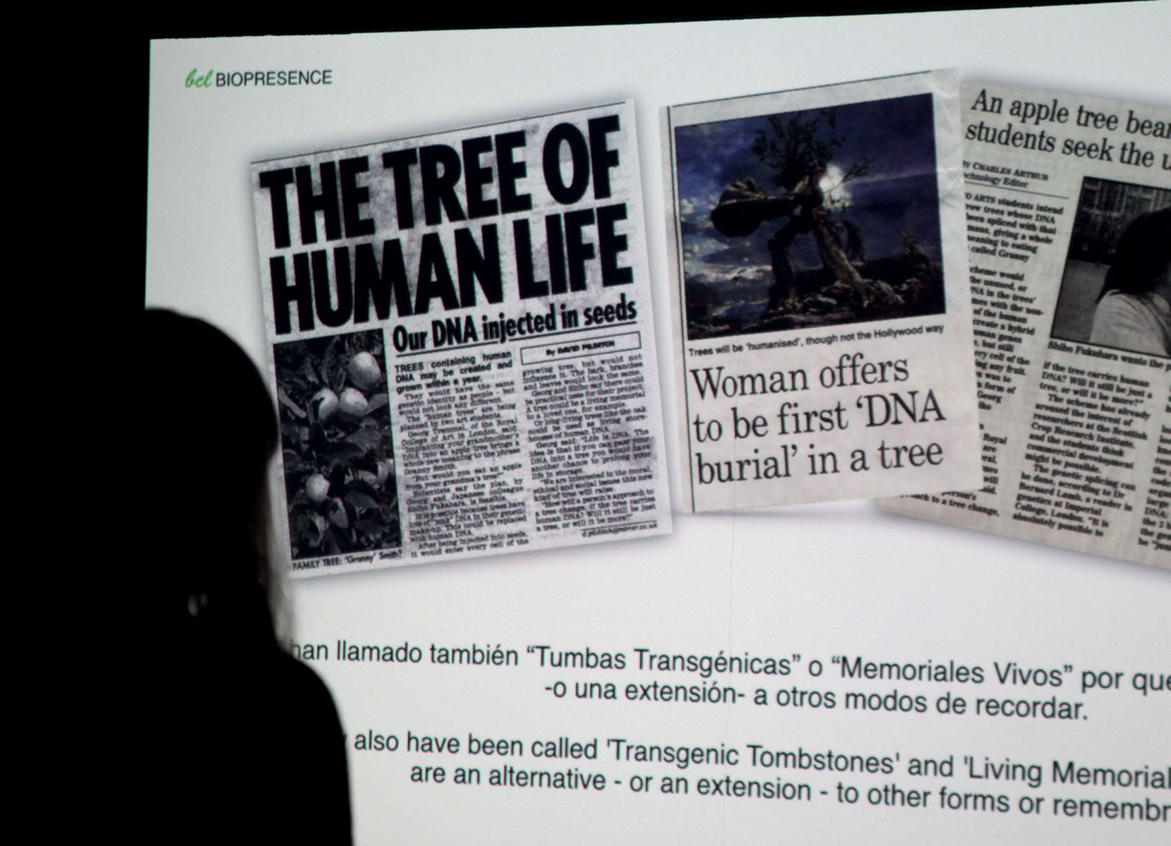 ........ Biopresence by Shiho Fukuhara (JP) and Georg Tremmel (AT) creates “Human DNA Trees” by transcoding the essence of a human being within the DNA of a tree in order to create “Living Memorials” or “Transgenic Tombstones.” Biopresence is collaborating with scientist and artist Joe Davis on his DNA Manifold algorithm, which allows for the transcoding and entwinement of human and tree DNAs.