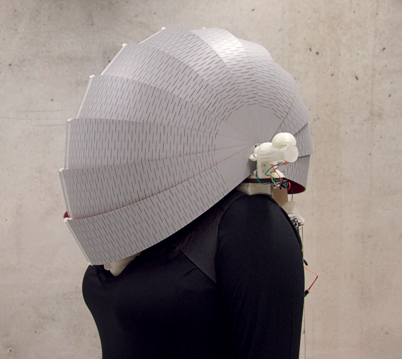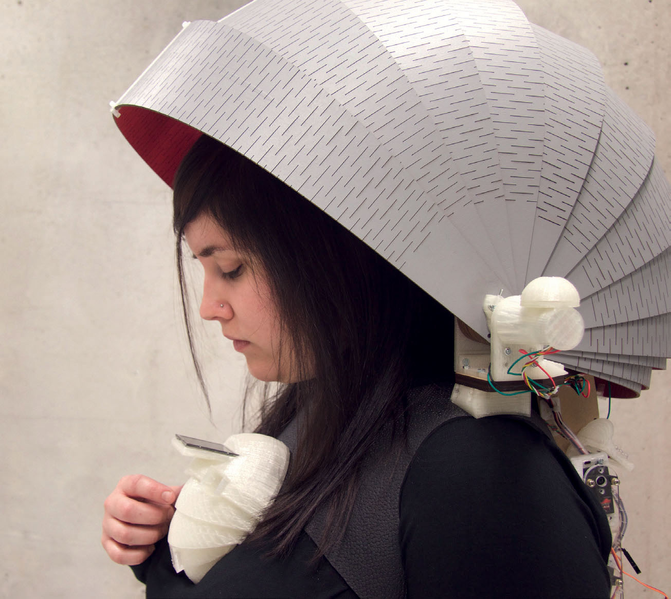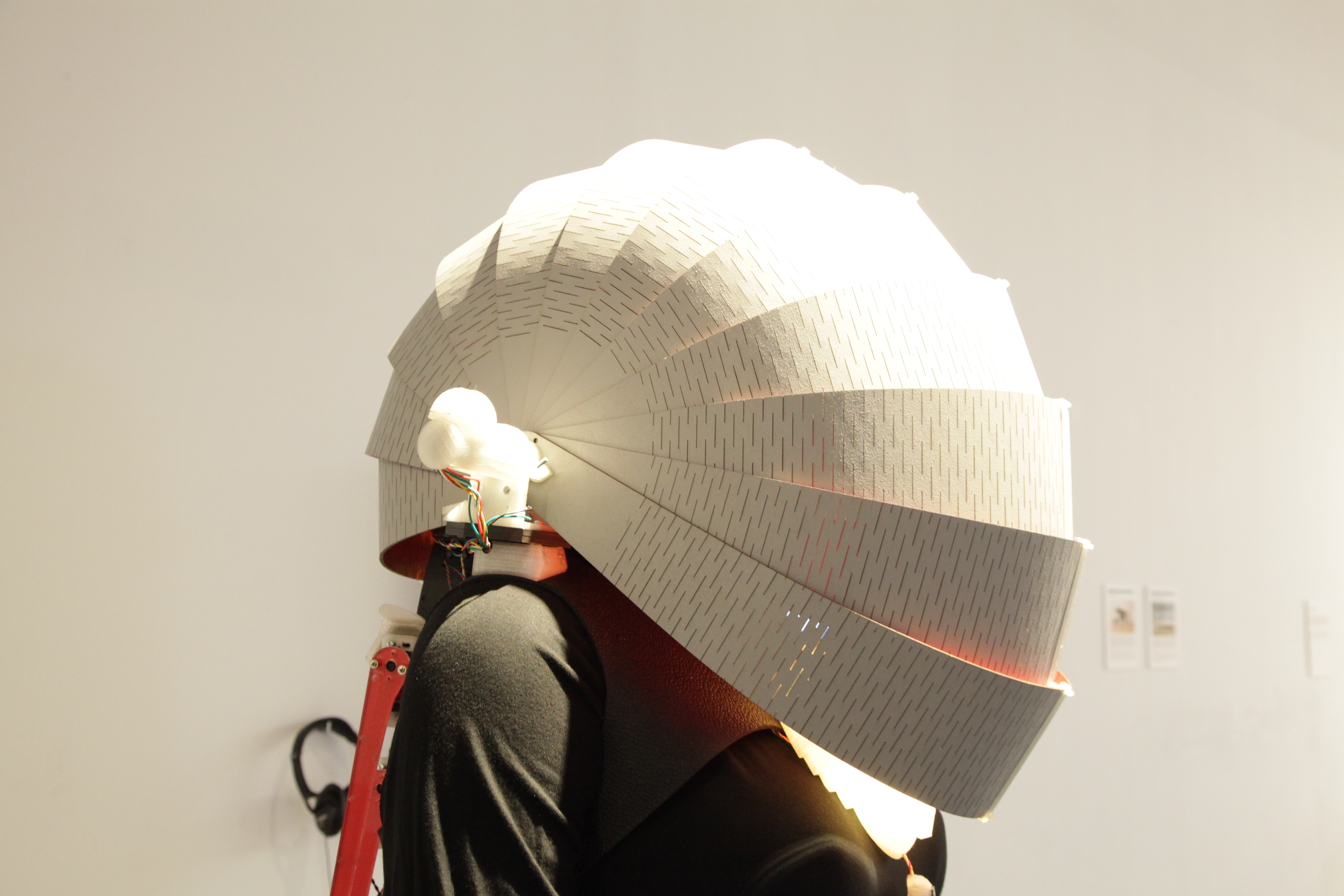 Asturian artist María Castellanos and Madrid native Alberto Valverde were two of the artists working in the FabLab during the exhibition. They explore certain man-machine relationships and intersections. Their work Environment Dress focuses on garments as a kind of sensory device for investigating variations in noise, temperature, atmospheric pressure, ultraviolet radiation, or the amount of carbon monoxide we are exposed to in our daily life. The person wearing this smart dress will receive direct feedback about his or her exposure through changes in the dress’s lighting.