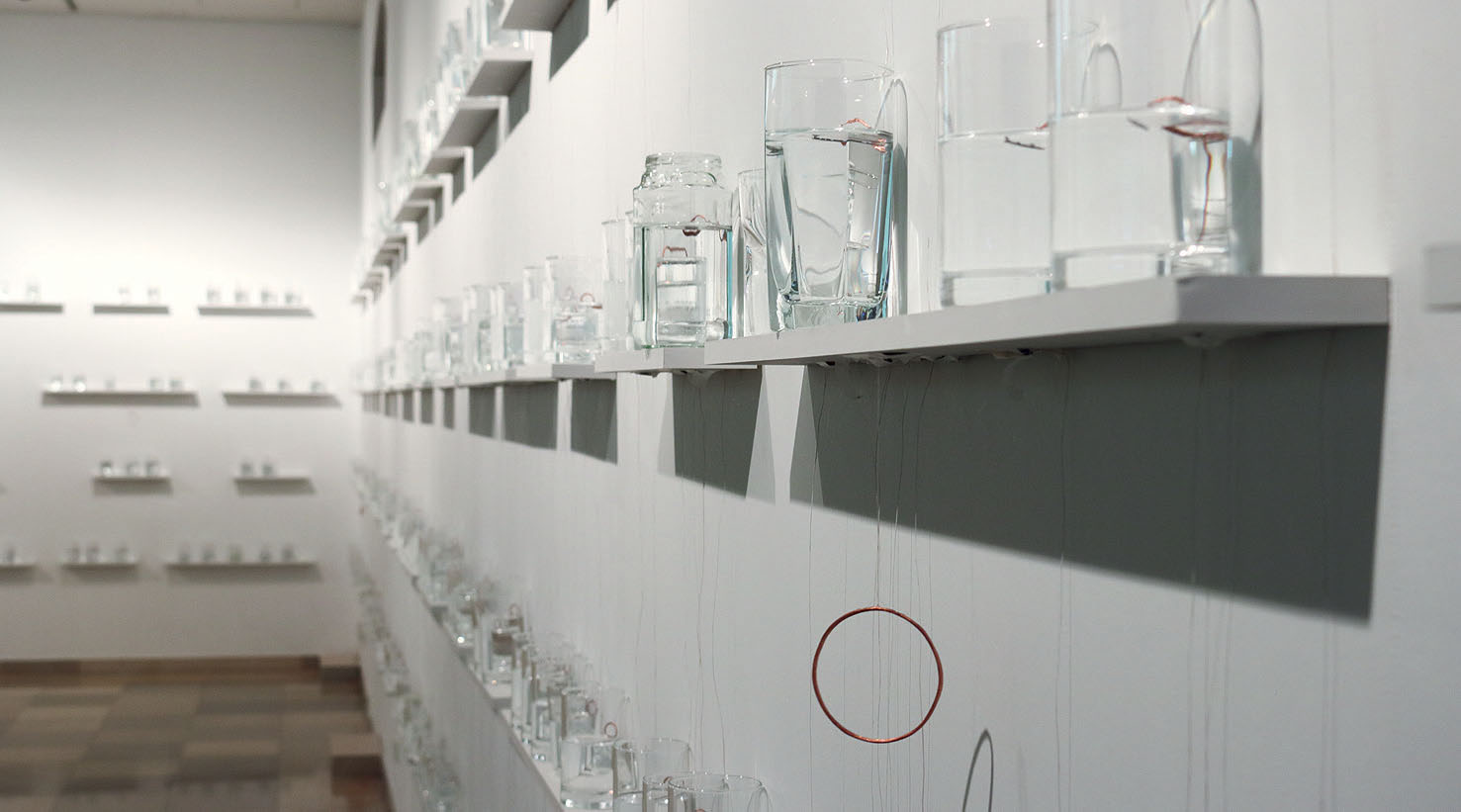 Chijikinkutsu by Nelo Akamatsu (JP) is a coinage, combining two Japanese words: “Chijiki” means geomagnetism. It is about terrestrial magnetic properties that have always existed and affect everything on earth, even though they cannot be perceived by the human senses. A “suikinkutsu” is a sound installation for Japanese traditional gardens, invented in the Edo period. The sounds of drops of water falling through an inverted earthenware pot buried under a stone washbasin resonate through hollow bamboo tubes. Chijikinkutsu is made using water, sewing needles, glass tumblers, and coils of copper wire. The needles floating on the water in the tumblers are magnetized in advance, so they are affected by geomagnetism and turn themselves in a north-south direction. When electricity is supplied to the coils attached to the outside of the tumblers it creates a temporary magnetic field that draws the needles to the coils. And the faint sound of the needles hitting the glass resonates in the space all around.