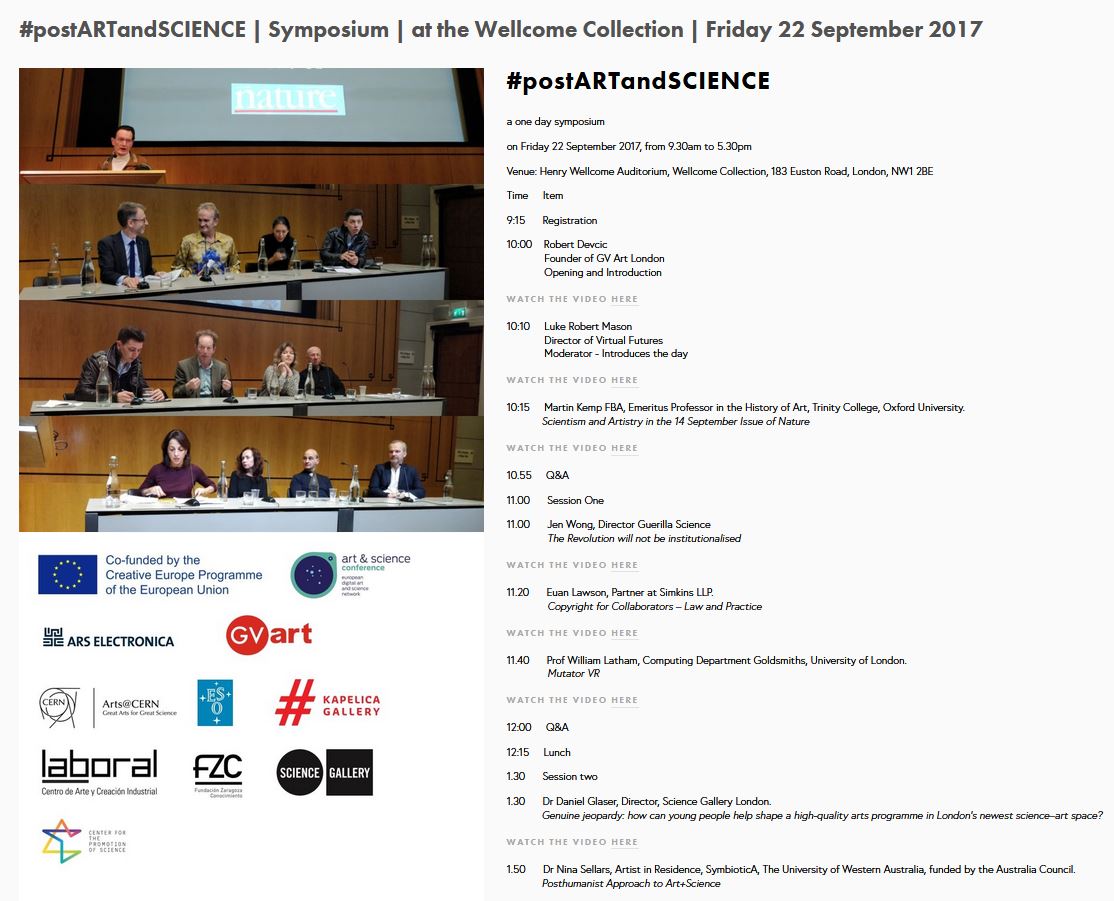 #postARTandSCIENCE one-day symposium Wellcome Collection auditorium 22.09.2017 Curated by GV Art London Speakers: Martin Kemp, Emeritus Professor of the History of Art, Trinity College, Oxford Joanna Zylinska, Professor of New Media and Communications, Goldsmiths, University of London Gary Hall, Professor of Media and Performing Arts, Coventry University William Latham, Computing Department Goldsmiths, University of London Stelarc, Performance artist and Distinguished Research Fellow, School of Design and Art, Curtin University Nina Sellars, Artist in Residence, SymbioticA, The University of Western Australia, funded by the Australia Council for the Arts Euan Lawson, Partner at Simkins LLP Moderated by Luke Robert Mason, Director of Virtual Futures https://www.gvart.co.uk/events-1/2017/8/22/postartandscience-symposium-at-the-wellcome-collection-friday-22-september-2017
