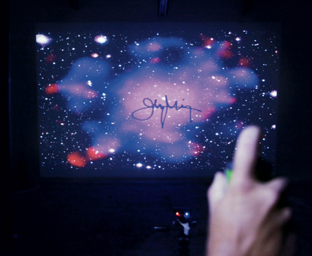 Dark Matter Spray (2016) is an interactive performance project which uses the hybrid VVVV programming software and infrared sensor interface in the shape of the spray can. Users can create a digital black matter that interferes with selected images from the ESA photo archive. The concept is based on the illusion of the correction of the light level (the absence of the light particles) while implanting the black digital matter in the 2D image area.