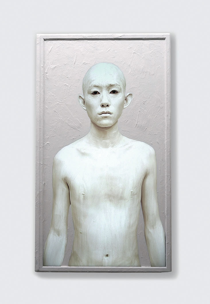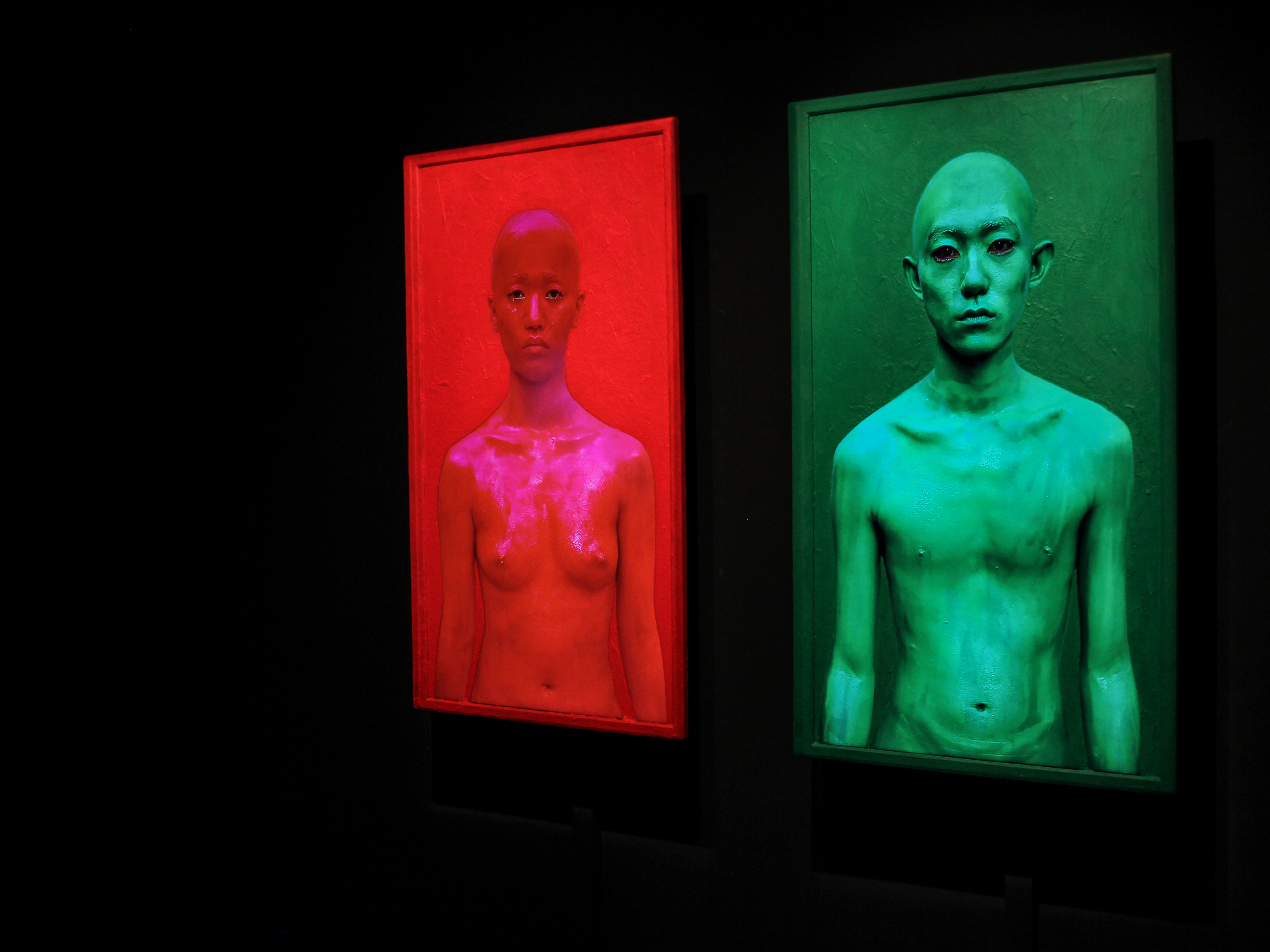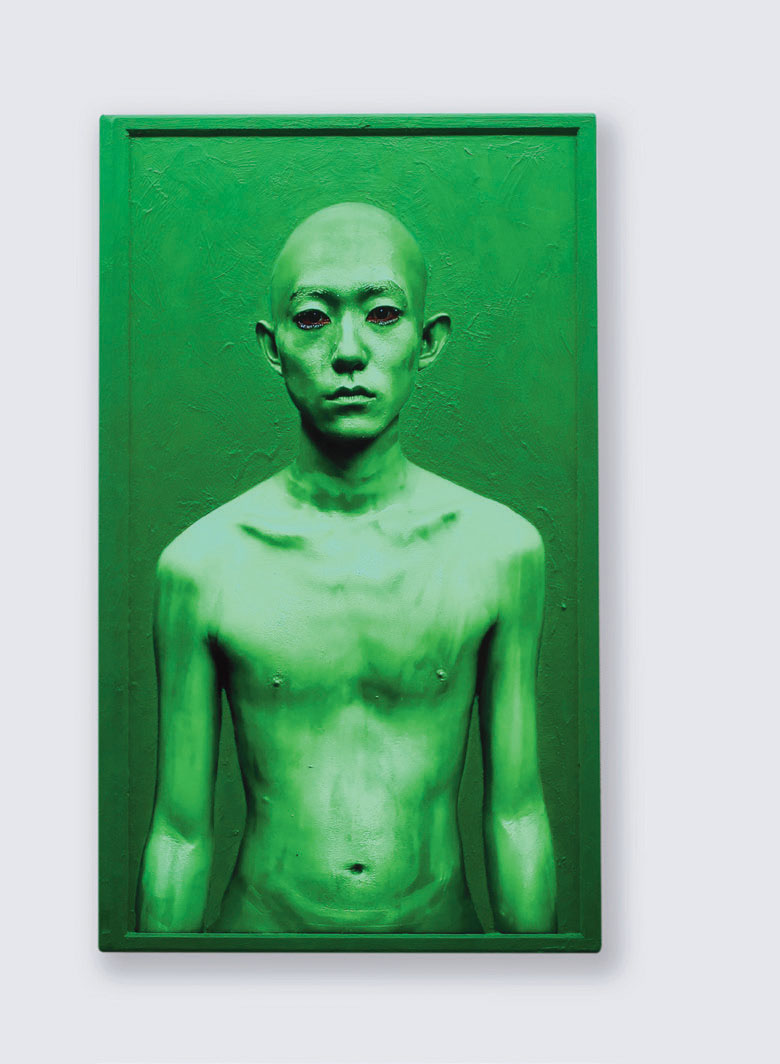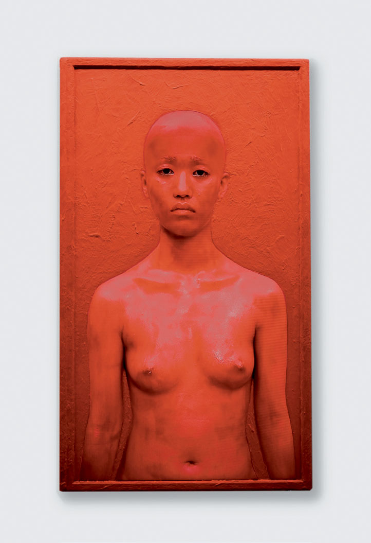 This work uses body painting to examine our physical definitions, our physicality, in a world of networked information devices. Each work in this portrait series features a person, nude, shaved, and painted entirely in a single shade of color, displayed on an LCD that has been entirely painted in the same color except for the human subject on the screen. The boundaries between background and foreground are erased—a human body and an electronic display body are both covered in the same color paint—and the works evoke the themes of ambiguity and confusion, and whether the individual depicted is a human being or a picture of a human being.