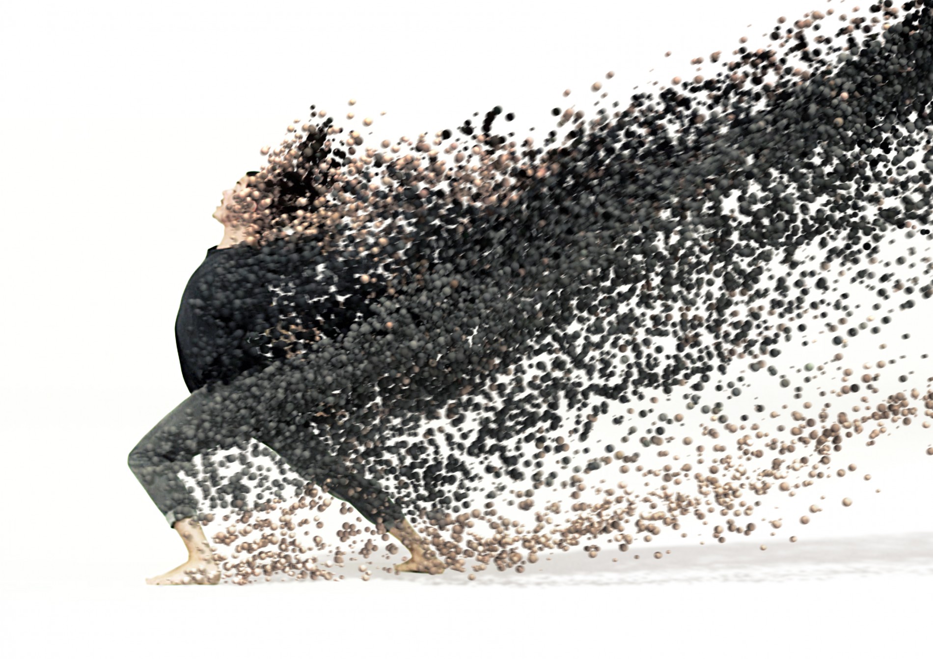 A lone figure struggles to make his way across a sparse, grassy landscape, seemingly battling the elements as they beat him back. His body starts to decompose, surrendering to the invisible physical forces, and he disappears into a cascade of particles.