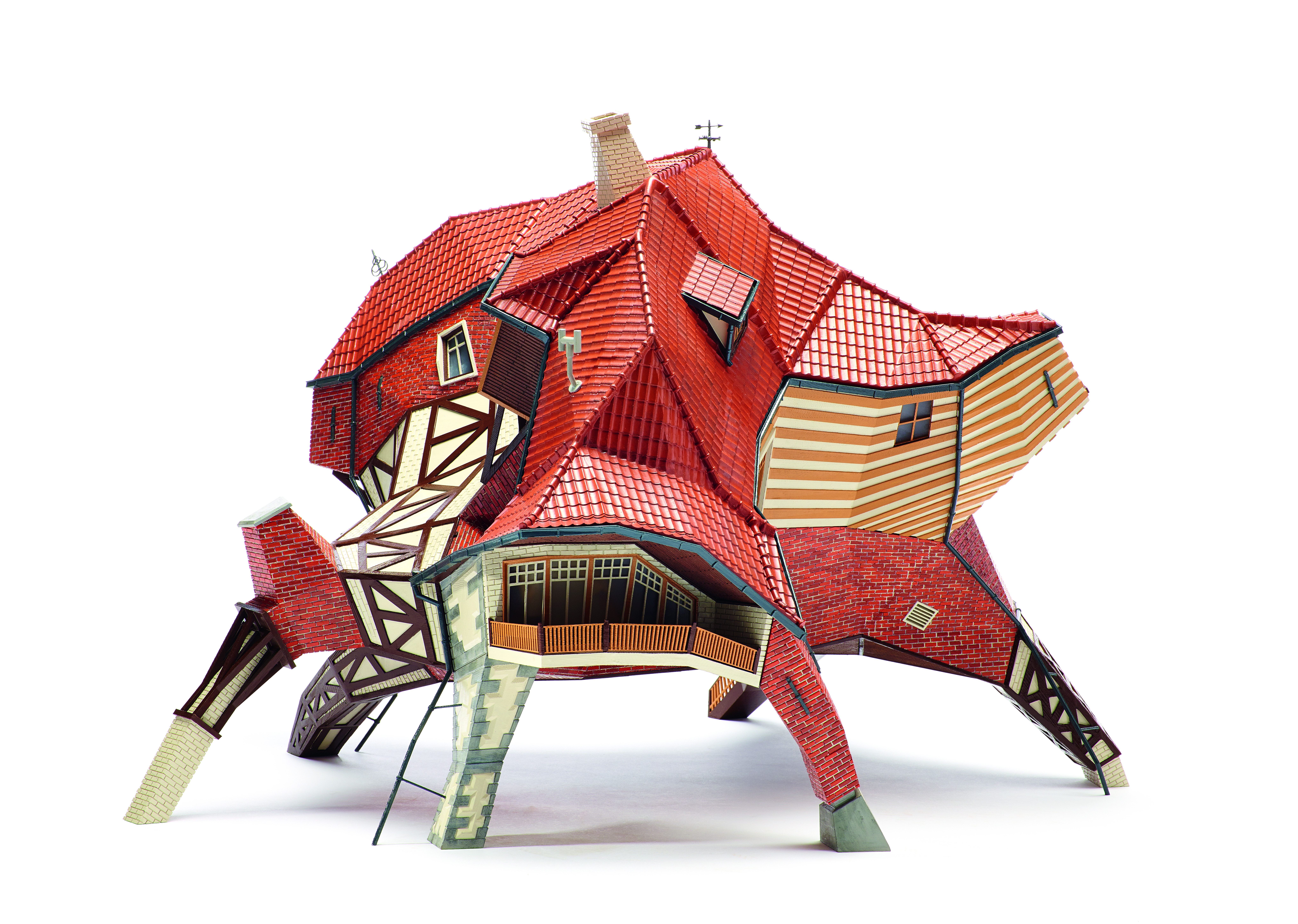 The EGATONK project was developed for the exhibition Horizon 8300 in Knokke, promoting new architecture for this Belgian seaside town.Nick Ervinck was invited to contribute an artwork to the exhibition. As a starting point Nick Ervinck uses traditional cottages, which he turns into absurd buildings. The cottages become figures with connotations to crabs and other sea animals that walk along the beach, resembling the impossible structures in the engravings of the mathematician Escher (1898-1972).