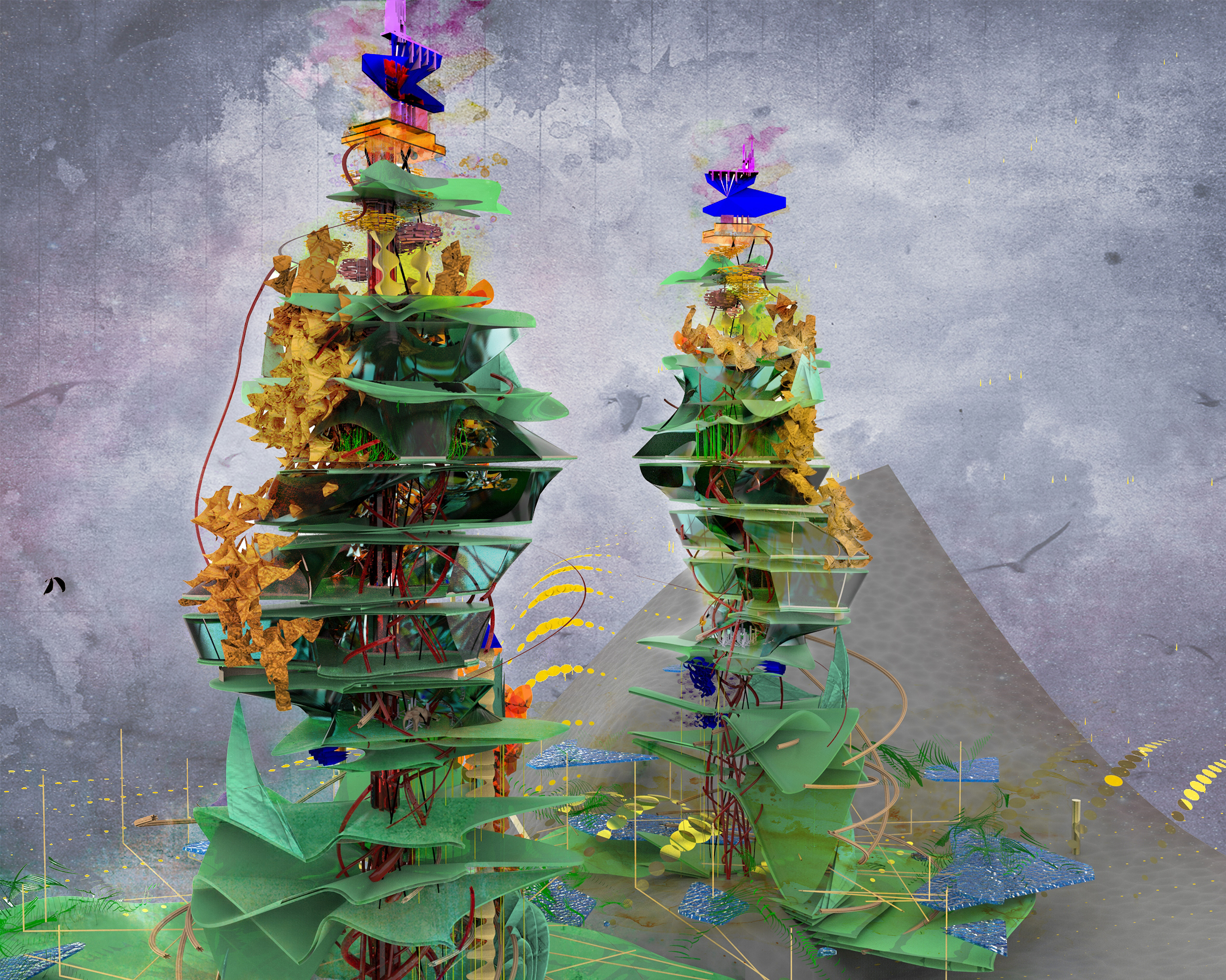 A vertical movement is introduced to the idea of space and city, placing emphasis on the space inbetween, the space where people meet and interact. Dynamics of a future urban reality between order and disorder. Frozen for display.