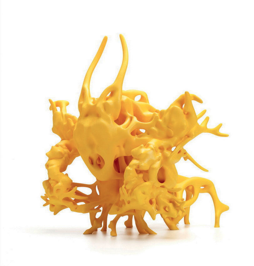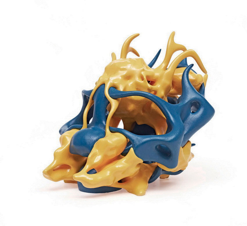 NIKEYSWODA / GARFINOSWODA seem made out of two components but are printed as one entity. The blue smooth form almost embraces the yellow explosive structure.