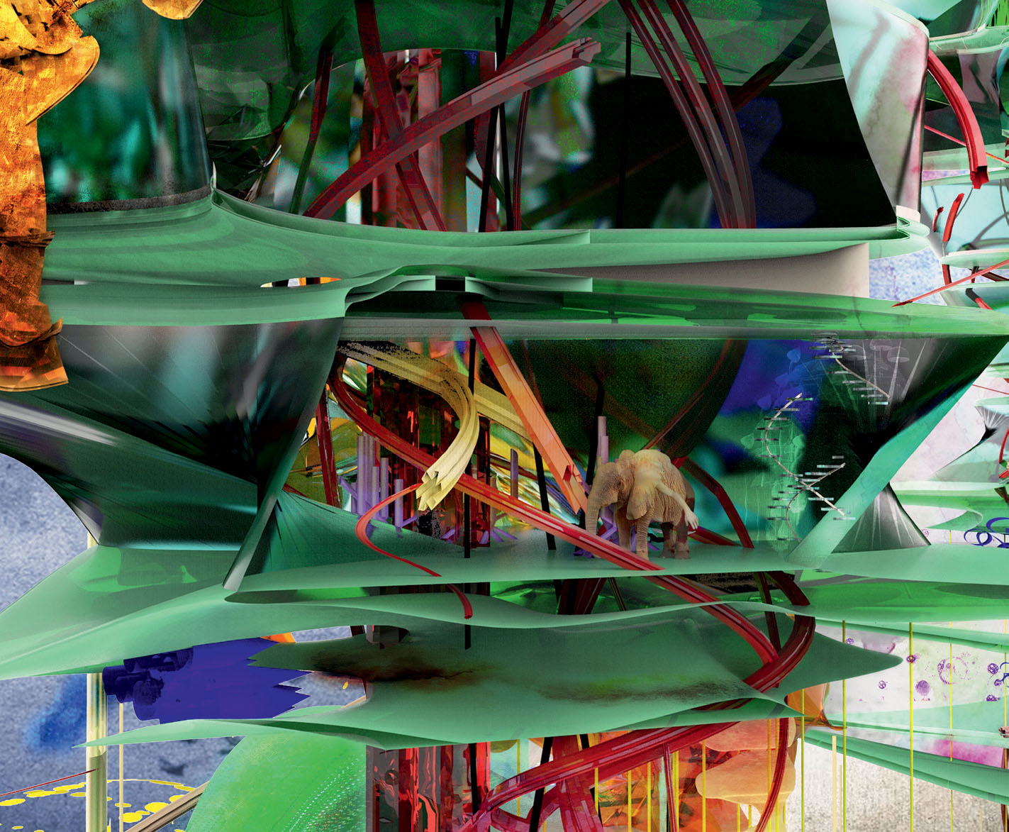 Welfare State 3000 displays a social housing unit for hybrids between animals and humans. It is built at a time when men and animals are all the same and DNA engineering has sufficient power to modify the human genome. People acquire major animal attributes like flying or a much-prolonged life span and require appropriate accommodation. Five cross-species live in a hybrid habitat, the so-called “unity of architecture and landscape.” Hybrids between ladybirds, elephants, anacondas, crocodiles, seagulls, and humans reside in this housing estate.