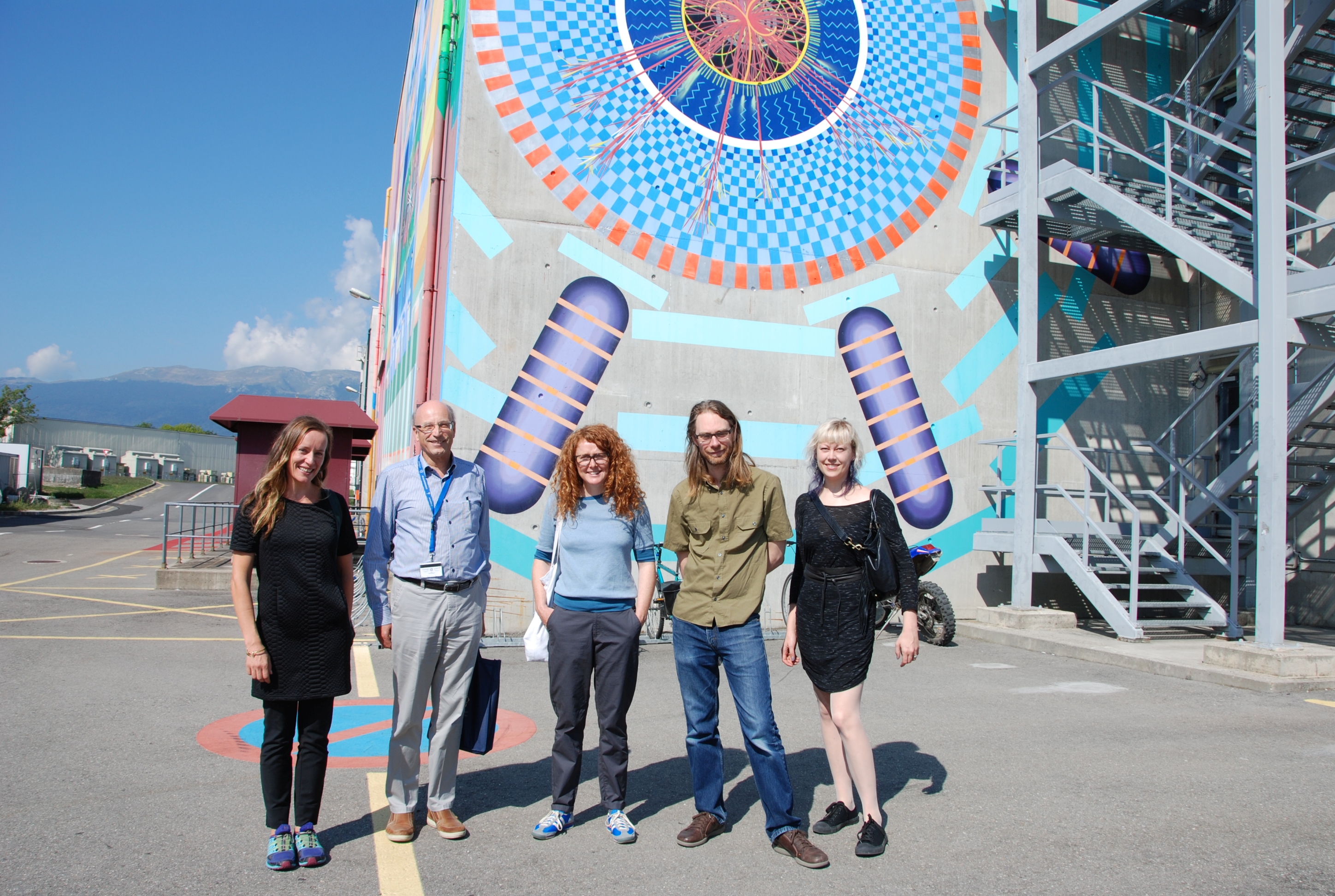 The UK artist duo Ruth Jarman and Joe Gerhardt aka Semiconductor during their introduction visit at CERN in Switzerland, preparing their residency after they have recieved the 2015 Collide@CERN Ars Electronica Award. Photo is showing Monica Bello (Head of Arts@CERN), Peter Jenni (physicist at CERN), Ruth Jarman, Joe Gerhardt and Claudia Schnugg (Ars Electronica Futurelab) in front of the ATLAS experiment. Credit: Julian Calo