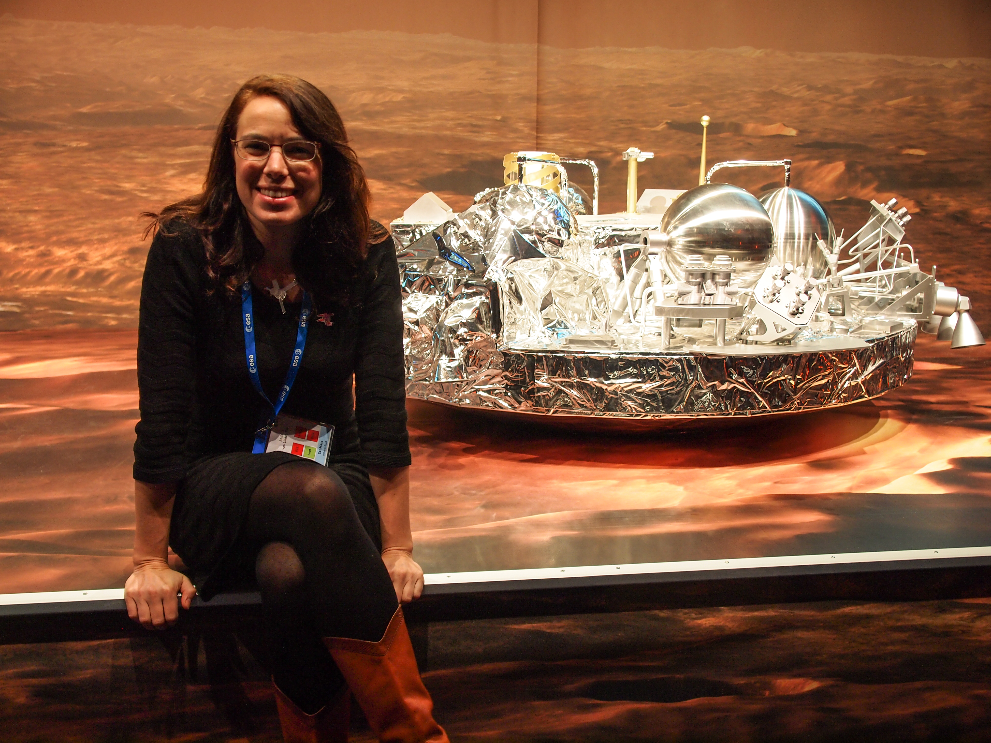 Aoife van Linden Tol (IE) is the first artist-in-residence hosted jointly by Ars Electronica and the European Space Agency (ESA). Photo showing Aoife Van Linden Tol in front of the Schiaparelli lander model at ESOC Darmstadt.