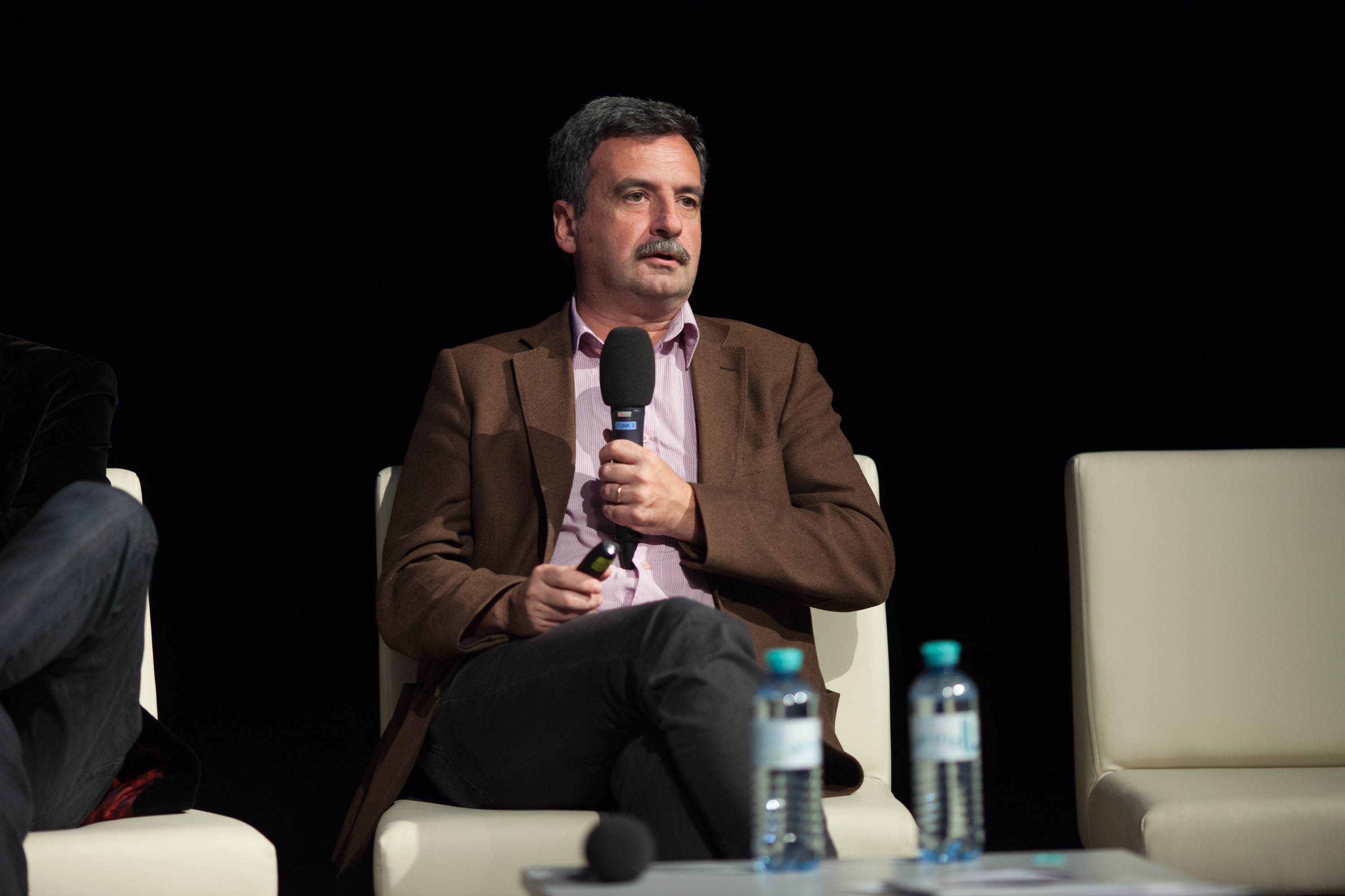 Photo showing Fernando Comerón (ES) at Prix Forum VI – Art & Science Round Table at Ursulinensaal in OÖ Kulturquartier.