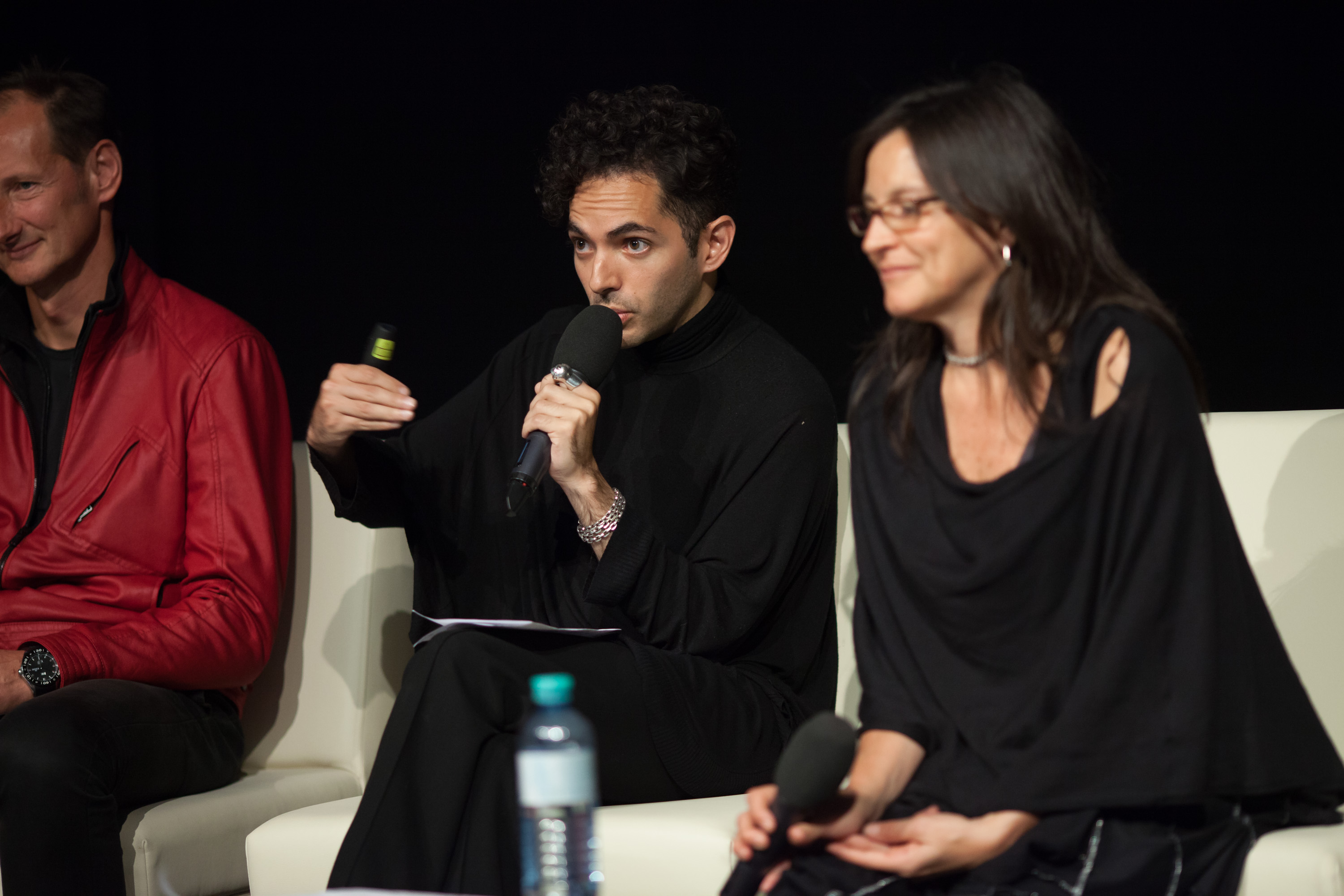 Photo showing from left to right Jurij V. Krpan (SI), Nahum (MX) and Ale de la Puente (MX) at Prix Forum VI – Art & Science Round Table at Ursulinensaal in OÖ Kulturquartier.