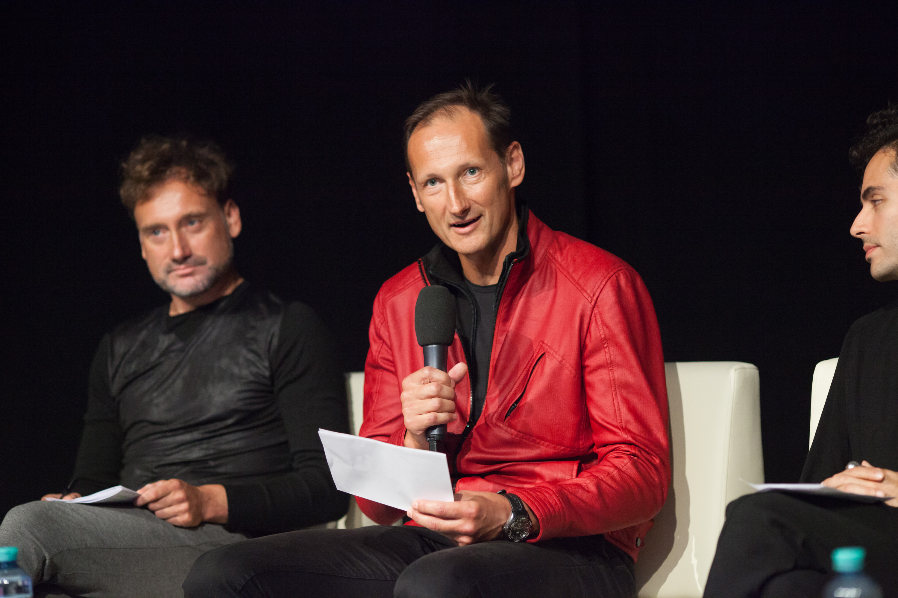 Photo showing from left to right Jens Hauser (DE), Jurij Krpan (SI) and Nahum (MX) at Prix Forum VI – Art & Science Round Table at Ursulinensaal in OÖ Kulturquartier.