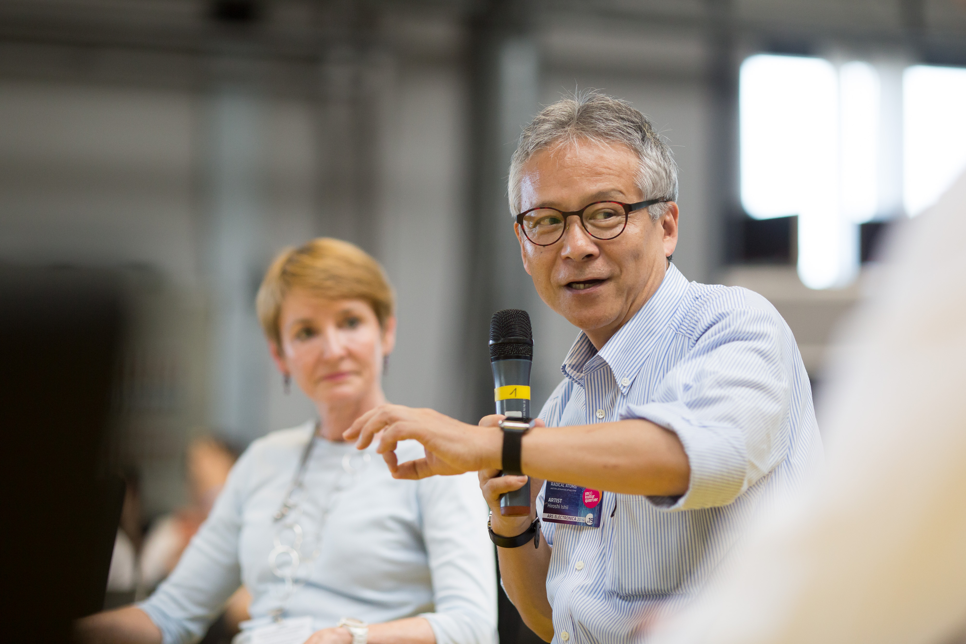 Photo showing Susan Street (AU) and Hiroshi Ishii (US/JP) at SYMPOSIUM III: ART AND SCIENCE AT WORK at POSTCITY.