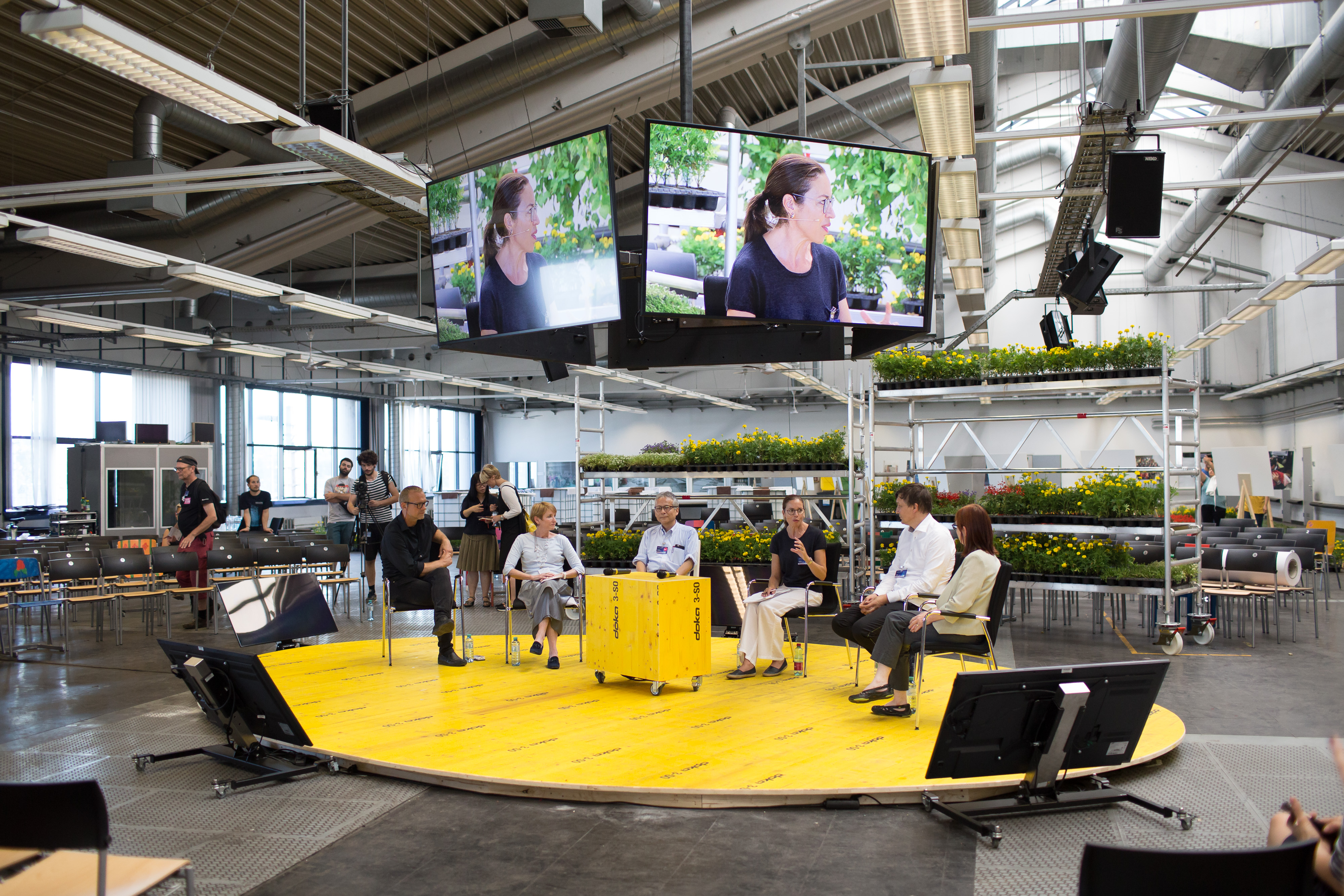 Photo showing, from left to right: Horst Hörtner (Senior Director Ars Electronica Futurelab), Susan Street (QUT), Hirsohi Ishii (Director of the Tangible Media Group / MIT), Yamina Aouina (Moderation), Ivan Poupyrev (Google ATAP) and Kathleen McCarthy during the SYMPOSIUM III: ART AND SCIENCE AT WORK at POSTCITY.