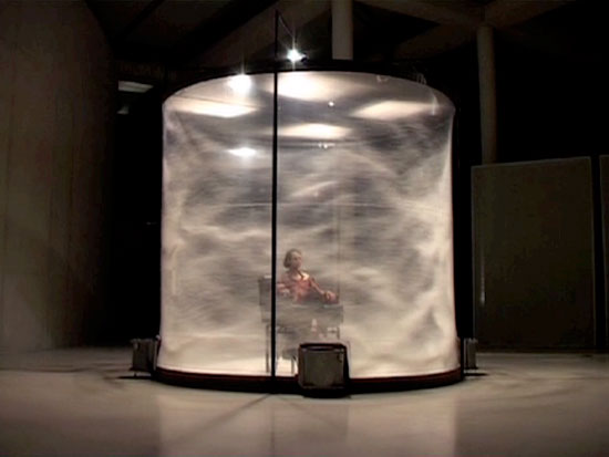 Styrofoam beads are blown around in a big transparent PVC cylinder by five strong fans. Visitors can take seat on the armchair in the middle of the whirlpool or observe from the outside one at a time. On the chair, in the eye of the storm, it is calm and safe. Spectacular at first sight, this installation turns out to mesmerize like a kind of meditation machine. One can follow the seemingly cyclical patterns, focus on the different layers of 3D pixels or listen to its waterfall sound. One could call it a training device, challenging the visitor to stay centered and to find peace in a fast-changing environment. After a while the space seems to expand and one’s sense of time becomes confused.
