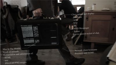 Facebook, AIM, ICQ, Yahoo, IRC, MSN Messenger chat will also appear on the briefcase alongside loud recital through a speaker on the case using a text-to-speech synthesizer.