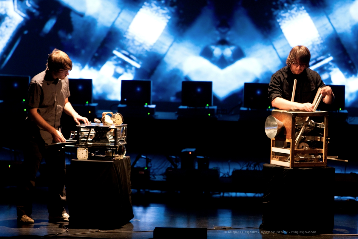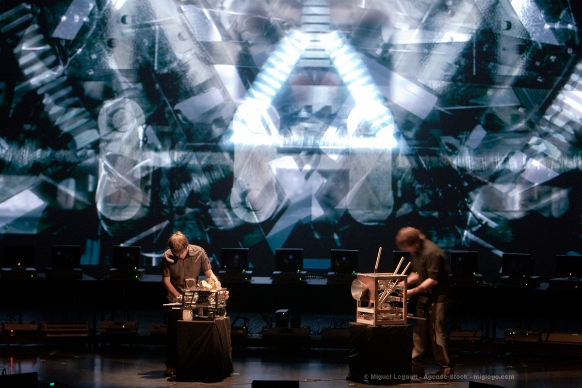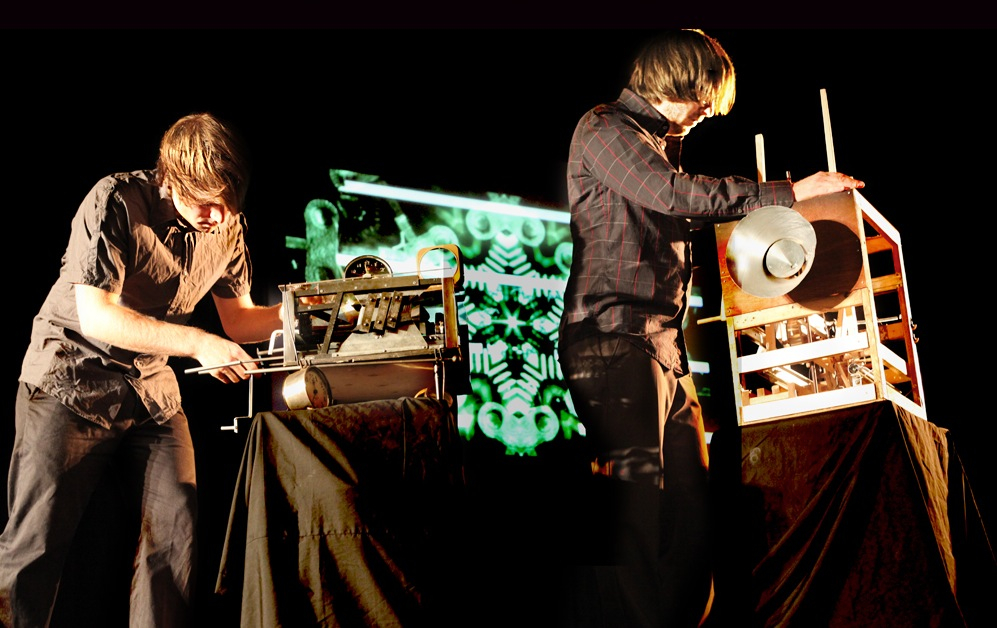 Machines made of gears and cranks are manipulated to produce a sound construction at the crossroads of acoustics and electronics. Submerged in surround sound, the audience discovers the interaction between mechanical and synthetic sound. With specifically tailored programming, digital processing is enlarging the sound palette of the machines. La chambre des machines stems from a desire to return to the physical world from an