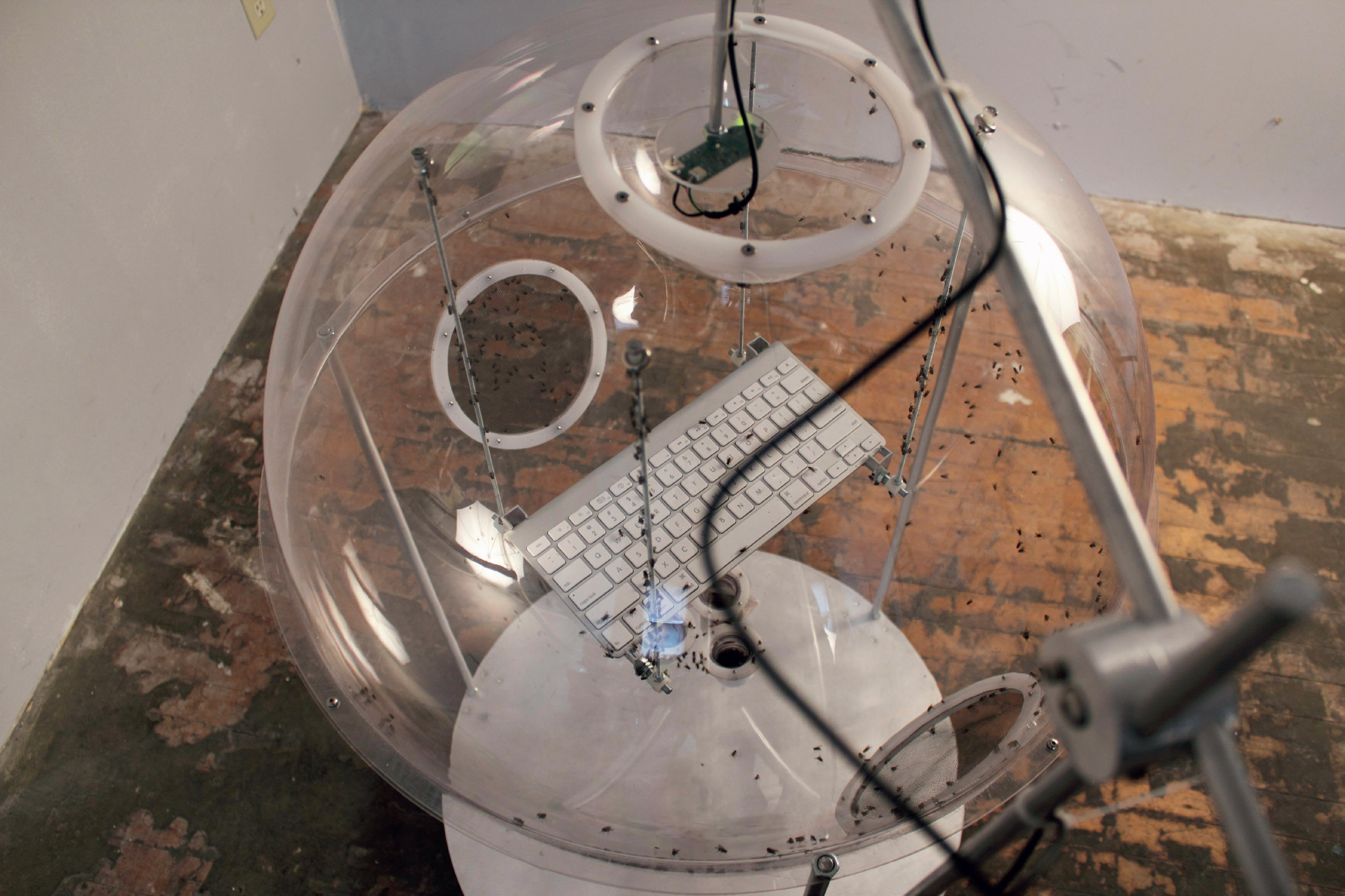 The _fly tweet_ device sends Twitter messages based on the activities of a collection of houseflies. The flies live inside an acrylic sphere along with a computer keyboard. As they move and interact inside their home, they fly over the keys on the keyboard. These movements are collected in real time on video. As a particular key is triggered by the flies, the corresponding character is entered into a Twitter text box. When 140 characters are reached or the flies trigger the “enter” key, the message containing the accumulated characters is tweeted. Thus live Twitter messages are constantly sent in real time based on the simple movements of the community of houseflies. These continually accumulating messages appear as records of random activity within the larger sphere of social media and networking.