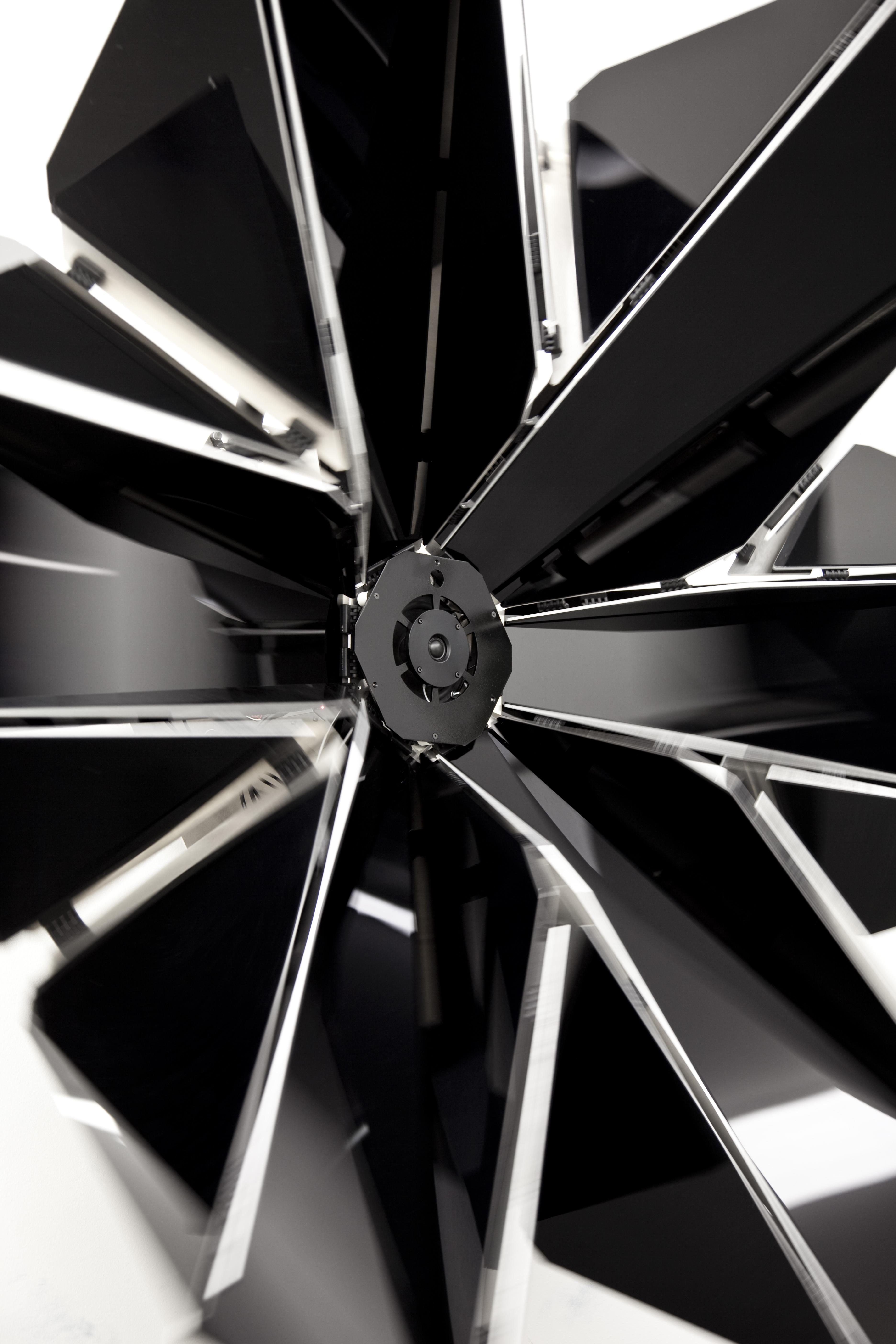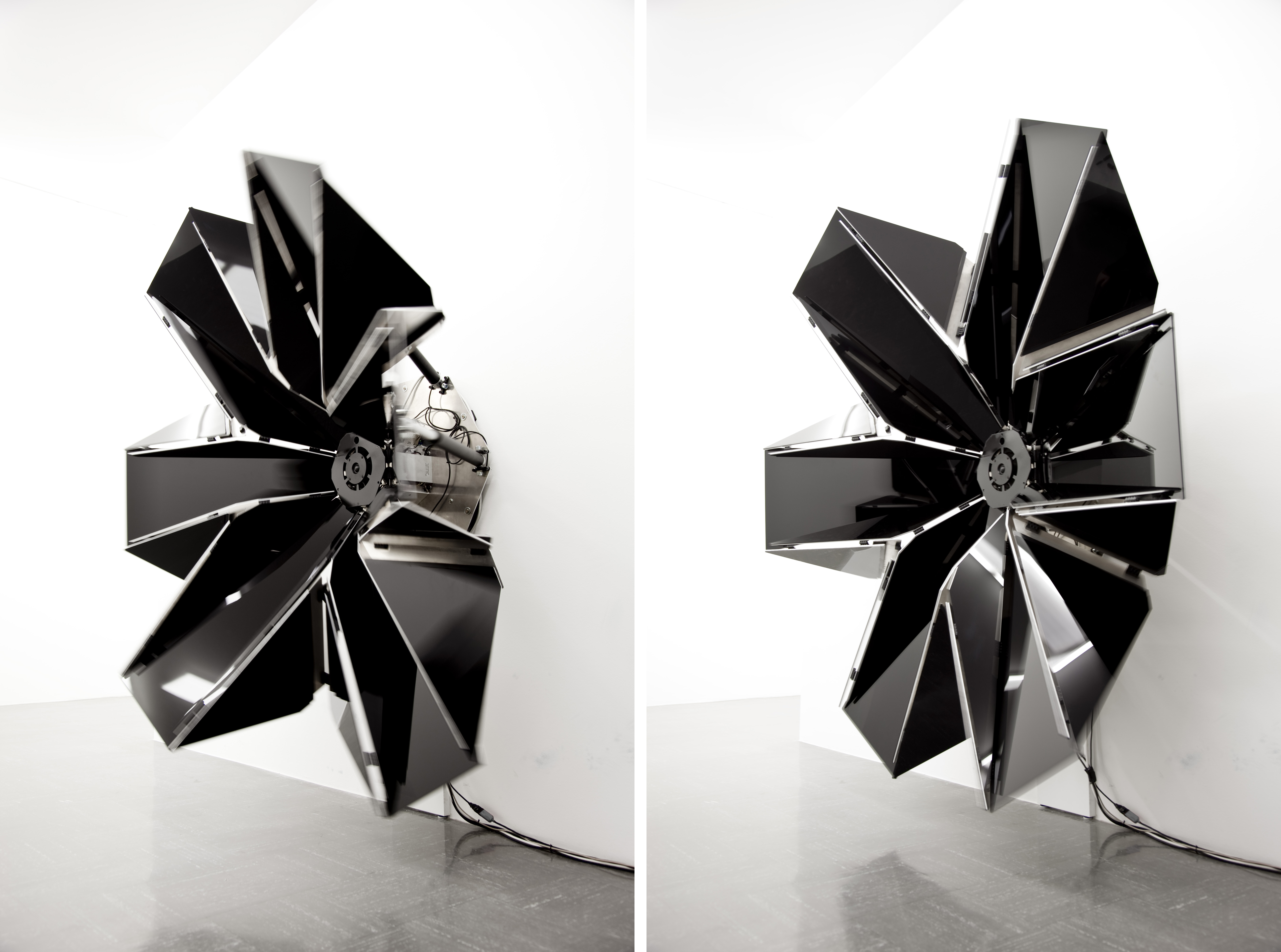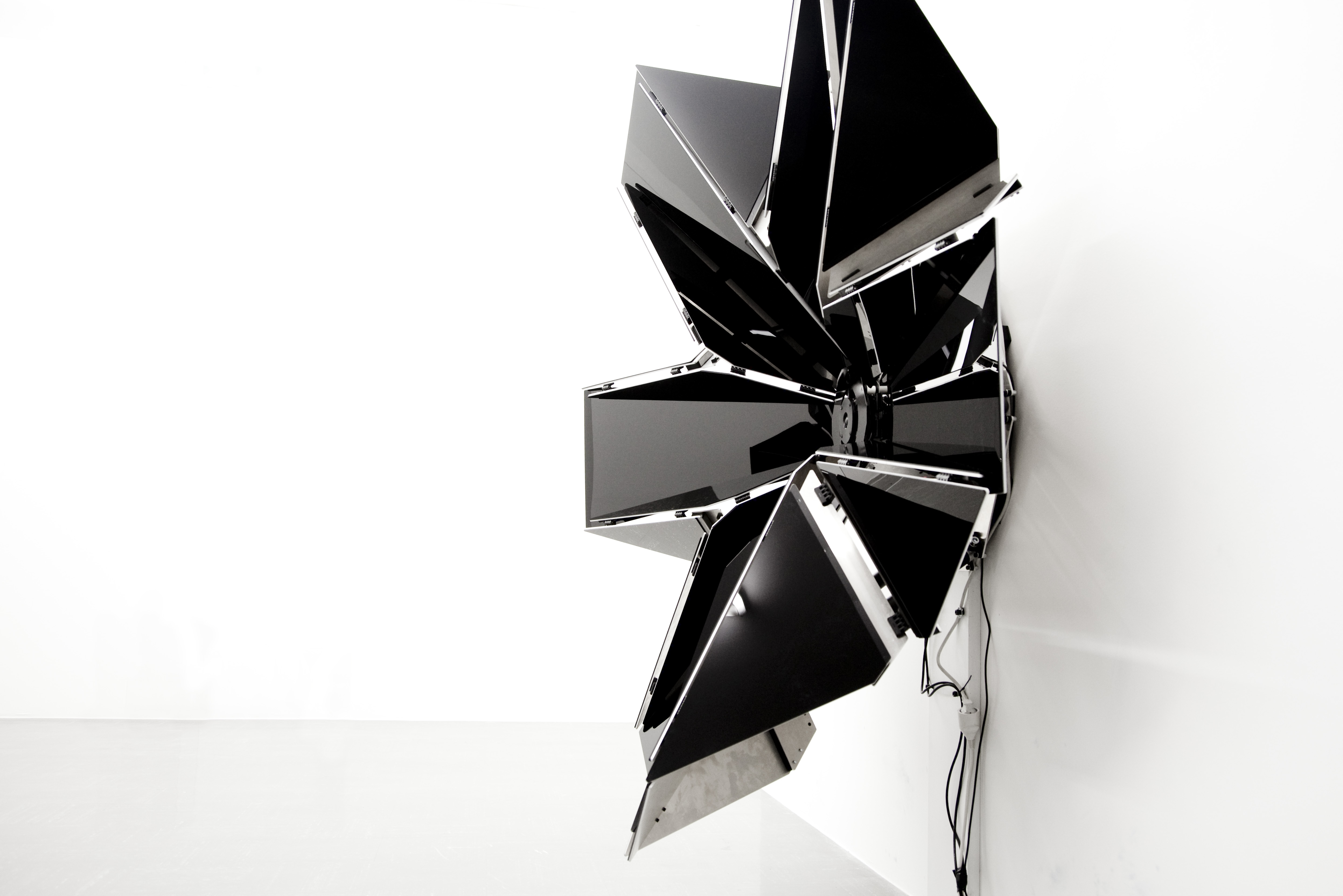_Versus_ is a sound installation consisting of two kinetic sculptures placed face to face. Each sculpture is made of 12 triangular panels, hinged and powered by six linear actuators, controlled by a specific program. At the center of each corolla, a loudspeaker and a microphone make it possible to play and record sounds.