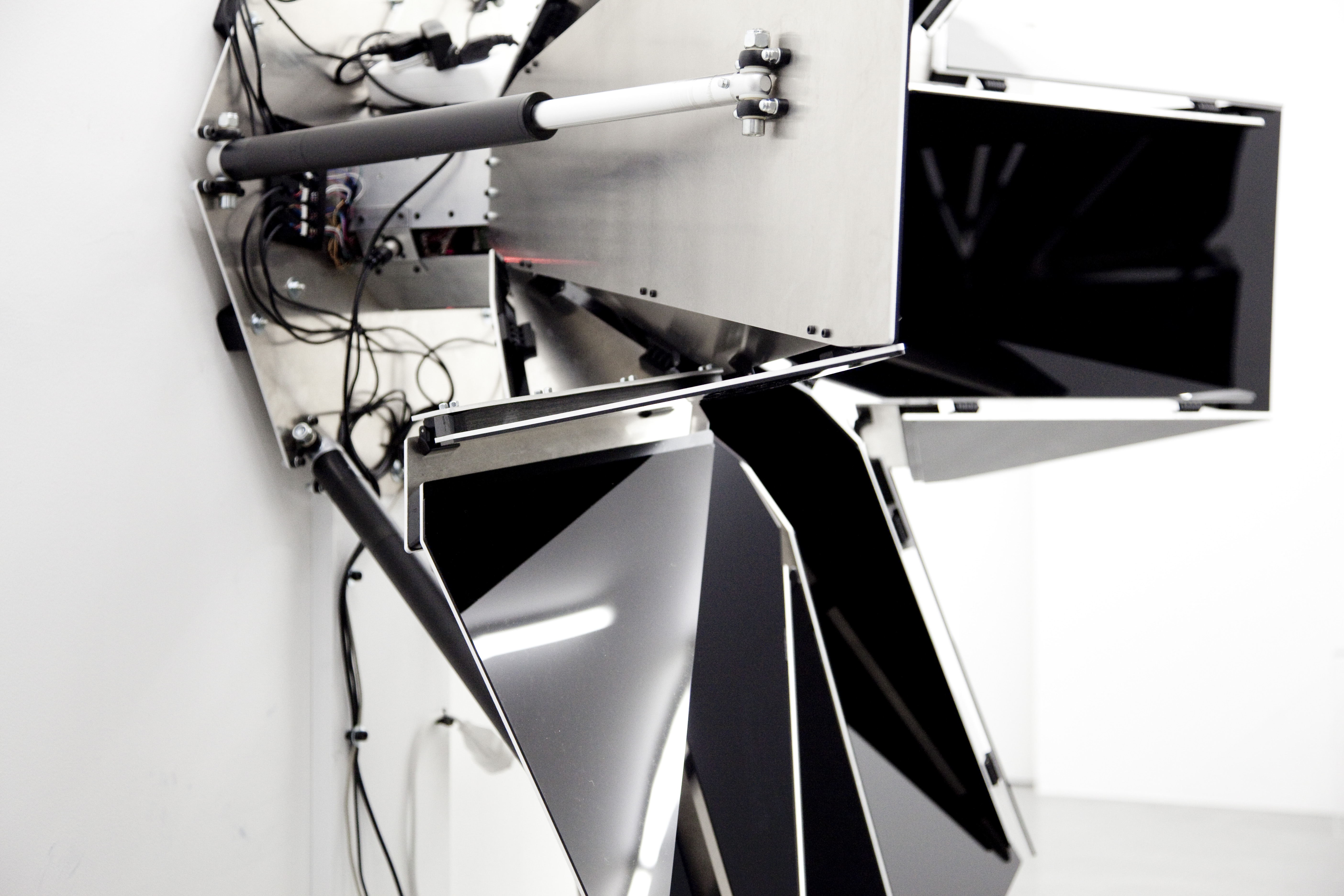 At regular intervals each sculpture produces a sound, simultaneously recorded and analyzed by the opposite sculpture, which then moves according to the frequencies of this sound.