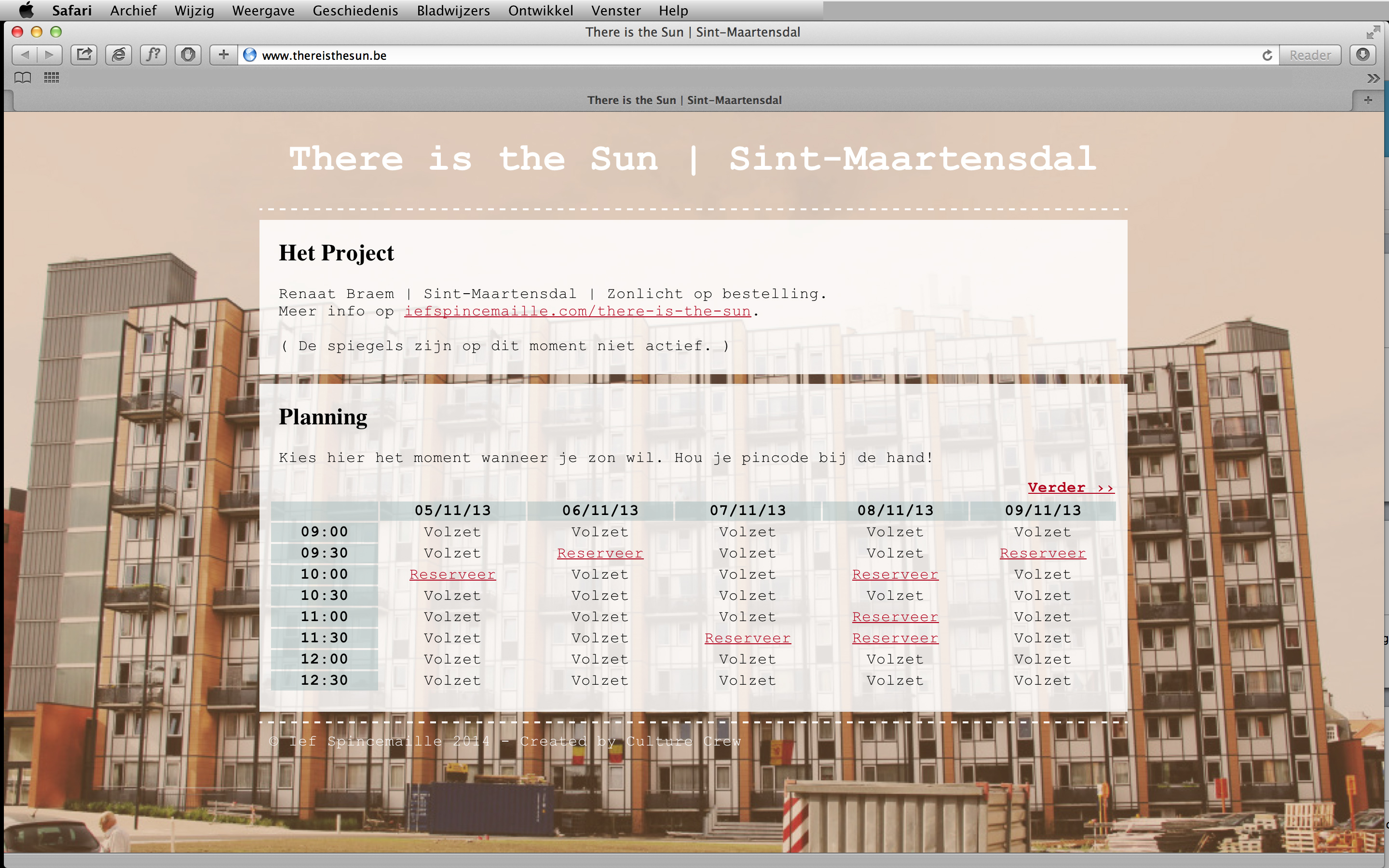 I placed three motorized mirrors to reflect sunlight towards one specific point. Using a user-friendly website, occupants could click on the date and time they wished to book sunlight for their apartment. One of the mirrors then turned to reflect the sunlight through their window. The directional aspect of the mirrors made them act like a spotlight: a mechanical system directed a small quantity of sunlight to one specific place. Check out *www.thereisthesun.be* for the online calendar with the reservations that were made.