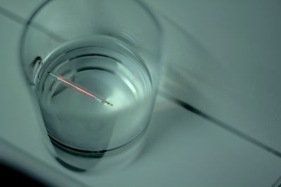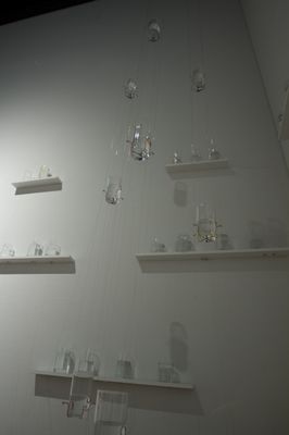 A round surface of water in the glass with a floating magnetized needle, reminds me somewhat of a tiny earth with its geomagnetism. The fainter the sounds of the glass, the more keenly viewers’ sensibility will be sharpened. In the meantime, they realize that the sounds are not coming from outside their bodies, but already exist inside their mind.