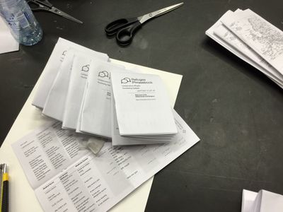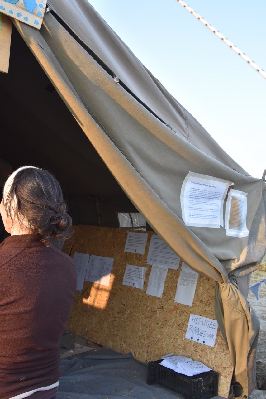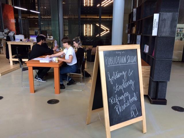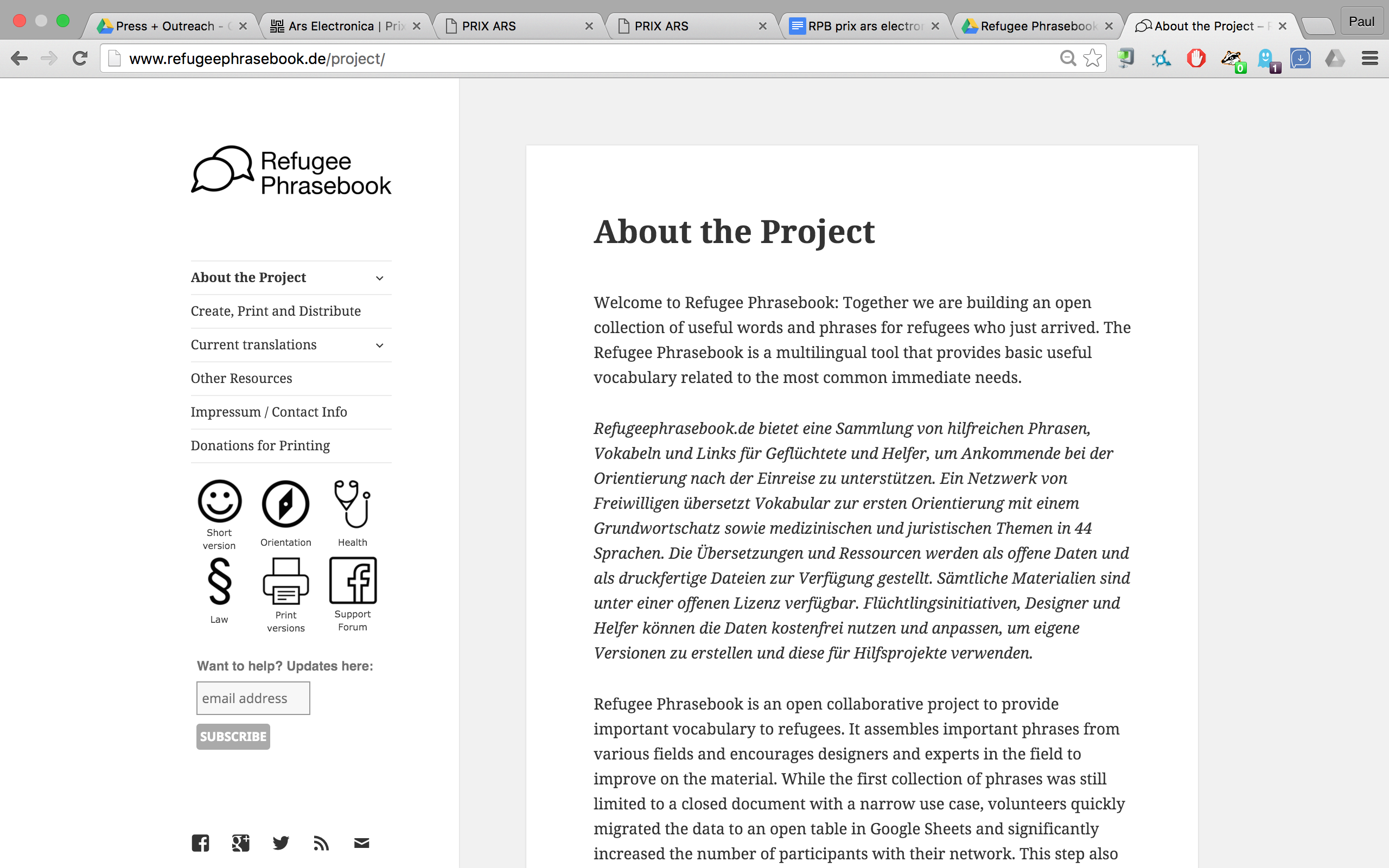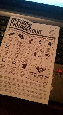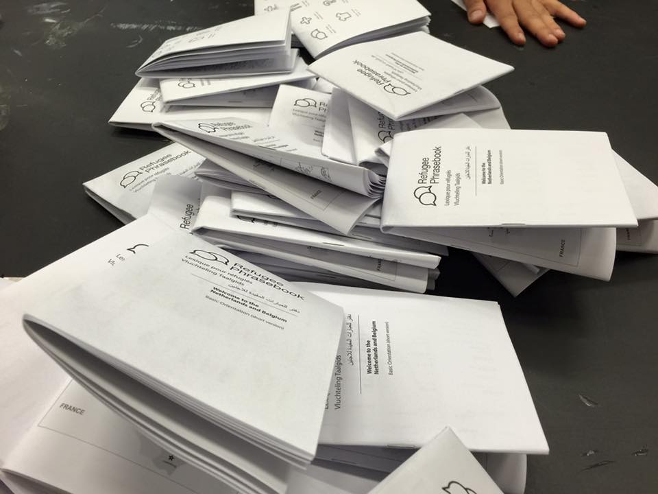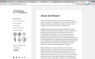 *Refugee Phrasebook* developed from several community projects in Berlin in August 2015 and quickly turned into an international, volunteer-supported open data project covering 44 languages. With the support of individuals as well as art and academic institutions, approx. 120,000 copies of several versions have been printed and distributed along the refugee routes, in shelters and other locations everywhere between Syria and Norway. In order to sustain the project and print more copies, the core team has expanded and we are looking for every support we can get to fund local printing. It has proven to be easier to print locally in e.g. Greece and to try to support this with donations, than to print in central Europe and ship. Nevertheless, the data remains open and can be reused and printed everywhere in the world. The data has been integrated into several other projects and apps, such as *Refugee Phrasebook Flashcards*, the Android apps *Refugee Phrasebook Interactive*, and InfoAid, or recently *Refugee Phrasebook* for Android and iOS. All these projects were developed independently by other volunteers.