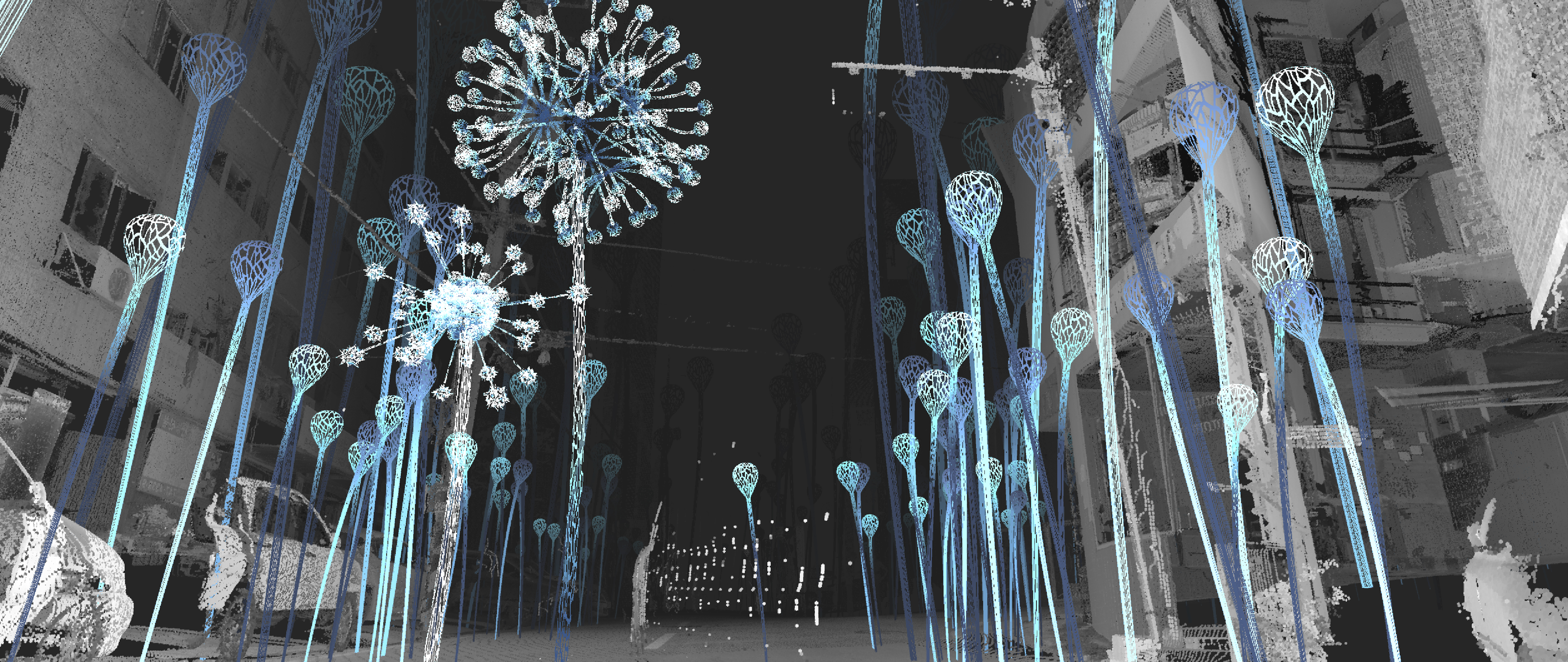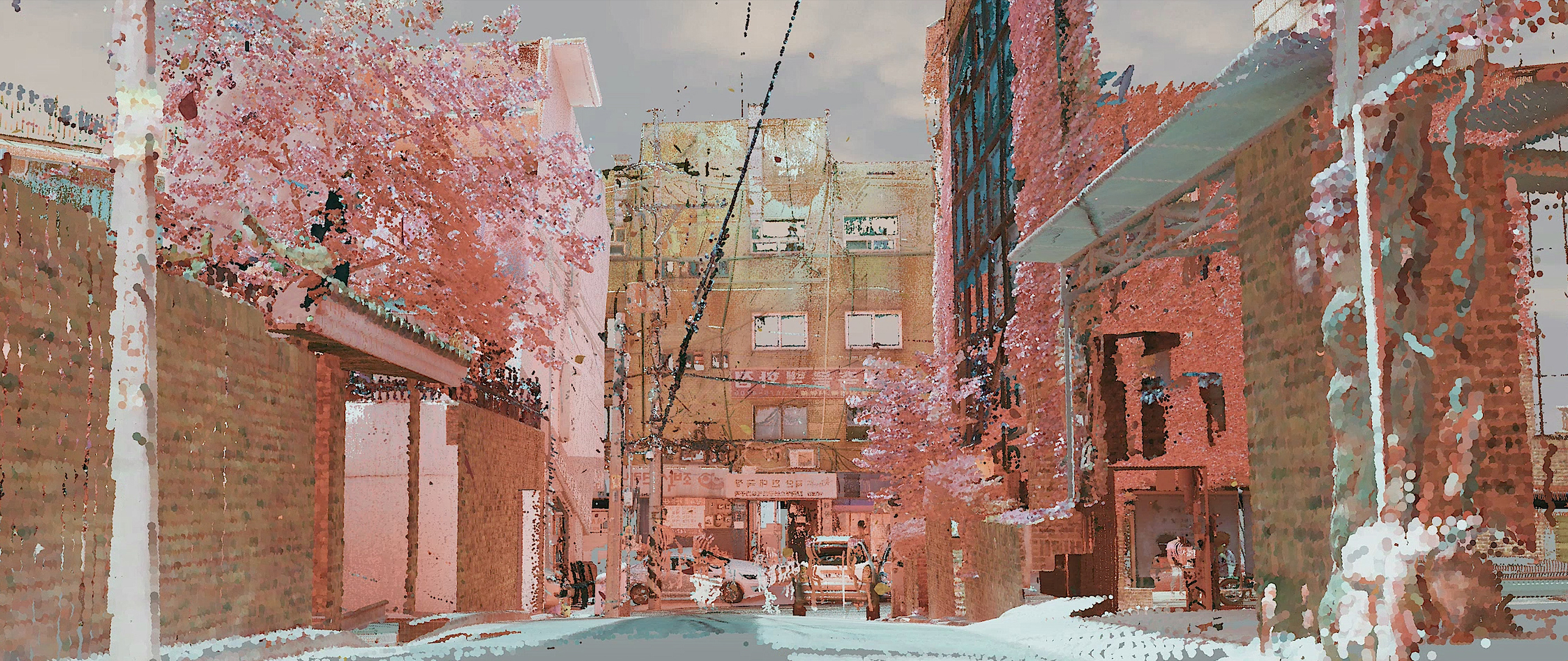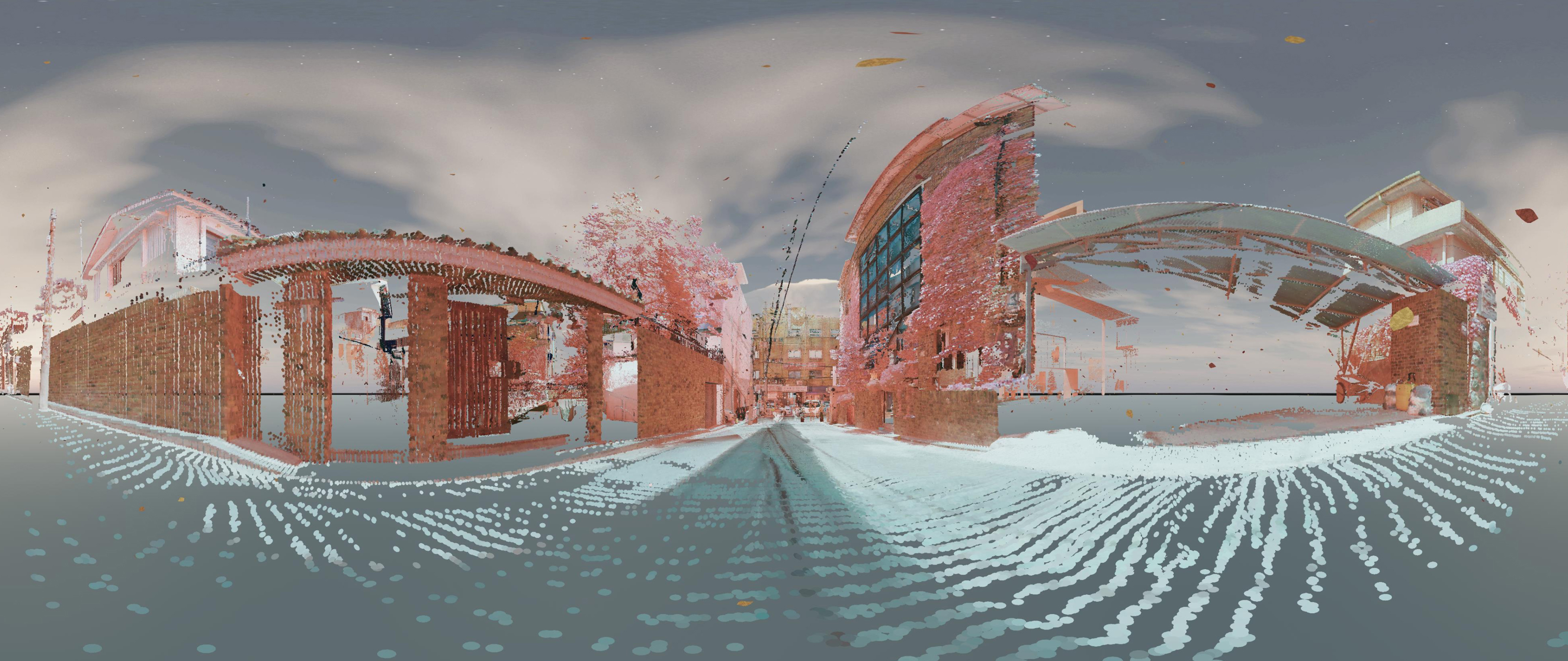 The *City Rhythm* project includes a section with the subtitle *LOST*, which shows the image of the city depicted as a point cloud, rendered by scanning the city with a 3D scanner. It seems to be packed with particles of dust—an ethereal hallucination in a virtual world. Departing from the boundless universe of data, we set our feet on one narrow street of Seoul. It felt even smaller than a dot. The entity you come across may be a joyful rhythm beating inside your heart, a lonely rhythm standing unaccompanied, or a hectic and restless rhythm that always has to be somewhere, anywhere but here. *LOST* embodies such rhythms.