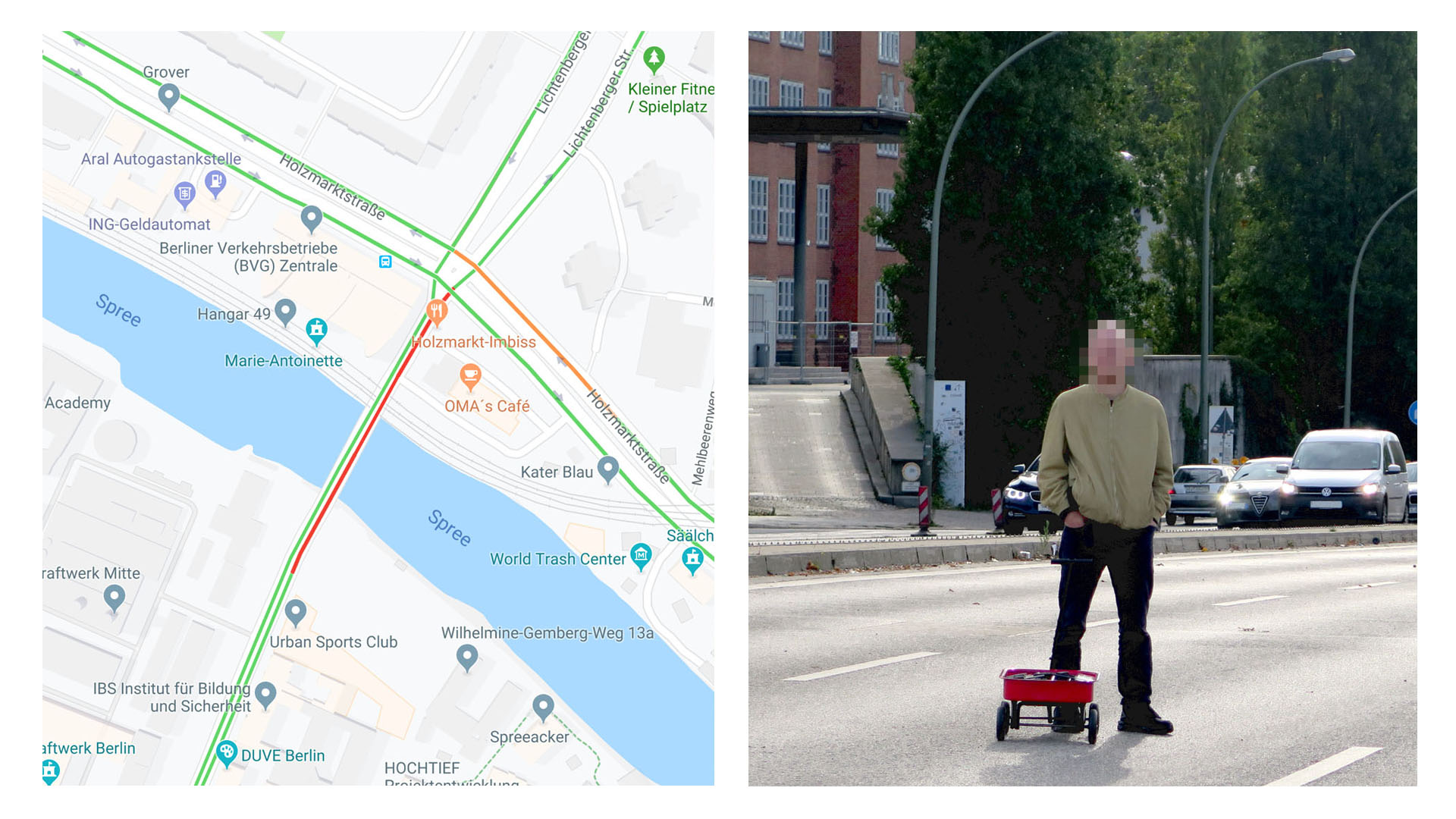 99 secondhand smartphones are transported in a handcart to generate a virtual traffic jam in Google Maps. Through this activity, it is possible to turn a green street red which has an impact in the physical world by navigating cars on another route to avoid being stuck in traffic.