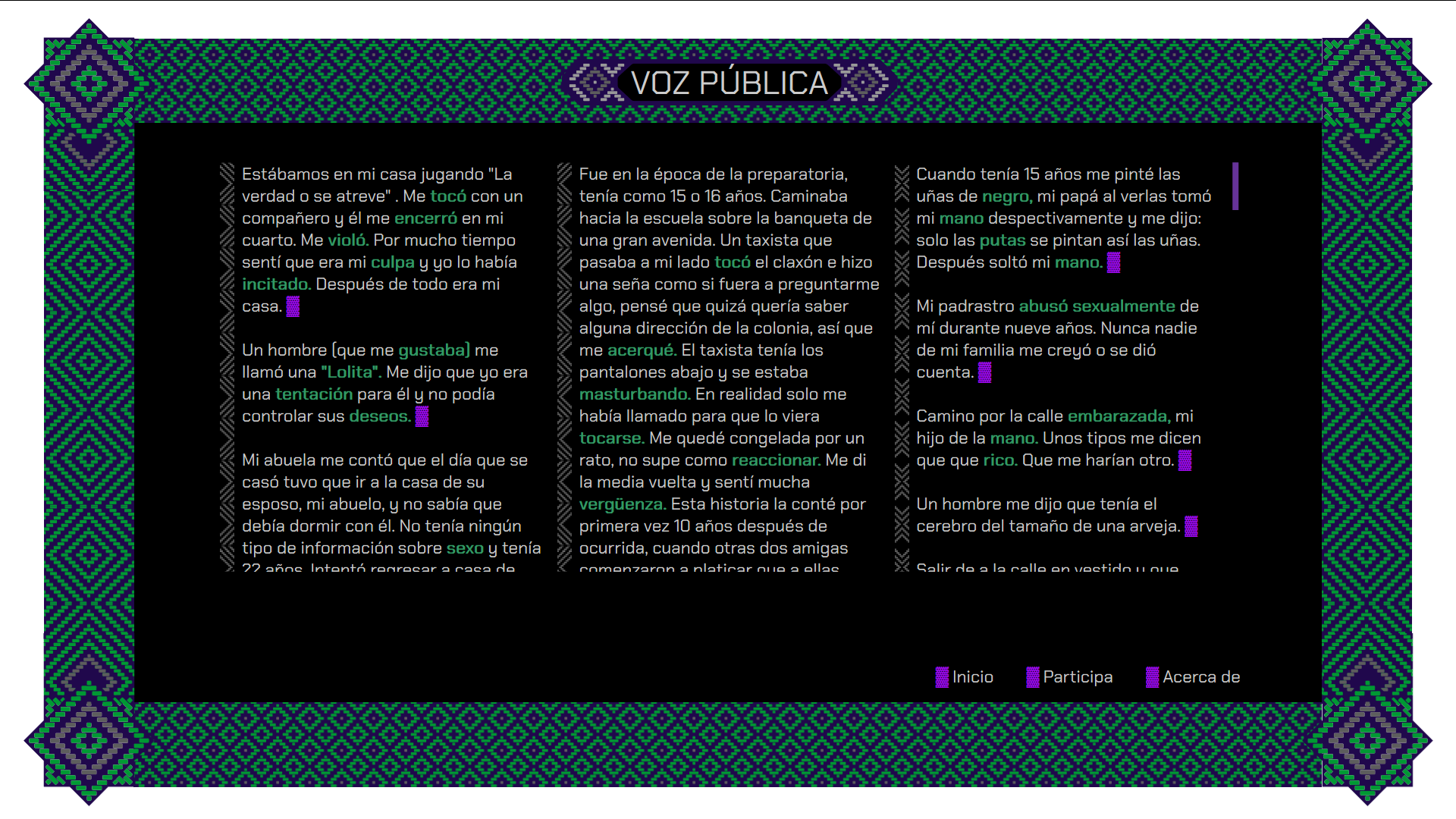 The first part consists of an online participation and visualization platform (www.vozpublica.cc), where women and non-binary people can share, in a textual and anonymous way, personal stories related to this problem. From these contributions a database is generated that is linked to the other two parts of the project.