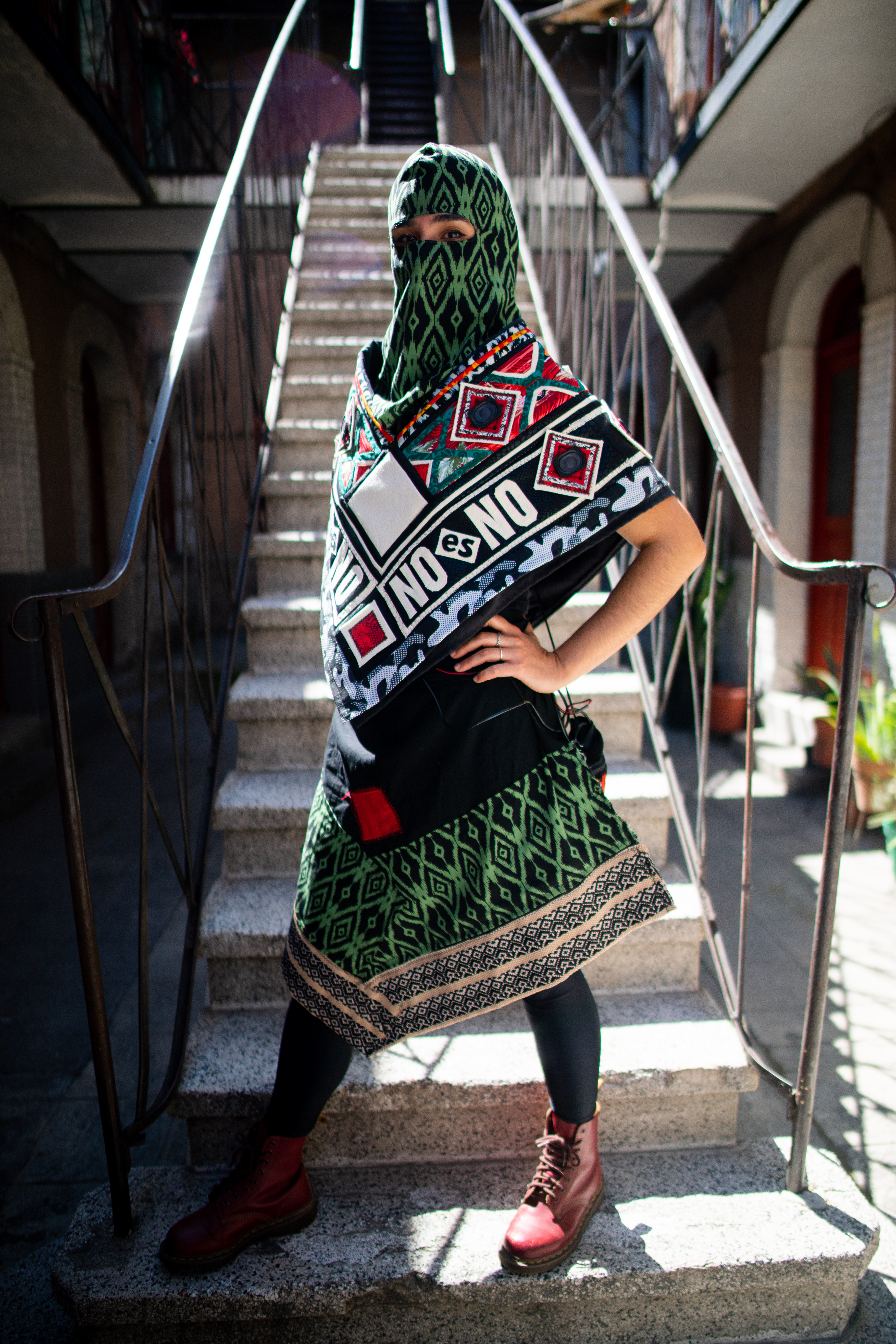The second part consists of an electronic textile that “gives voice to and amplifies” these stories through a voice synthesizer, giving them physical presence in the public space. This textile takes as visual reference the Latin American textile tradition, and graphics related to activist and feminist struggles. The electronic part of the textile consists of an embedded computing system, conductive thread, and an array of micro-speakers. In this way, the textile connects to the Internet, downloads the database of testimonials, converts them into voice, and amplifies them in an automated way.