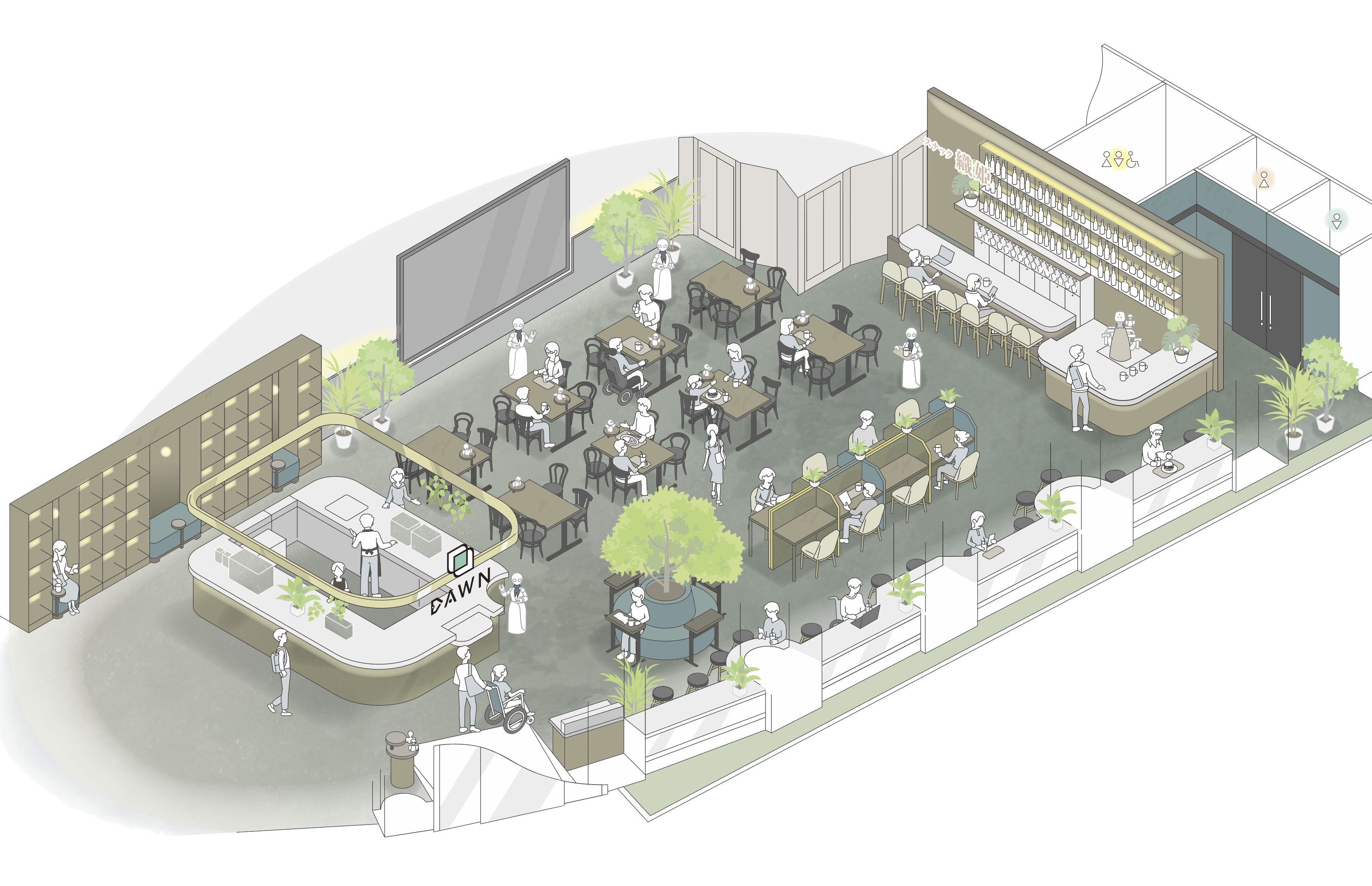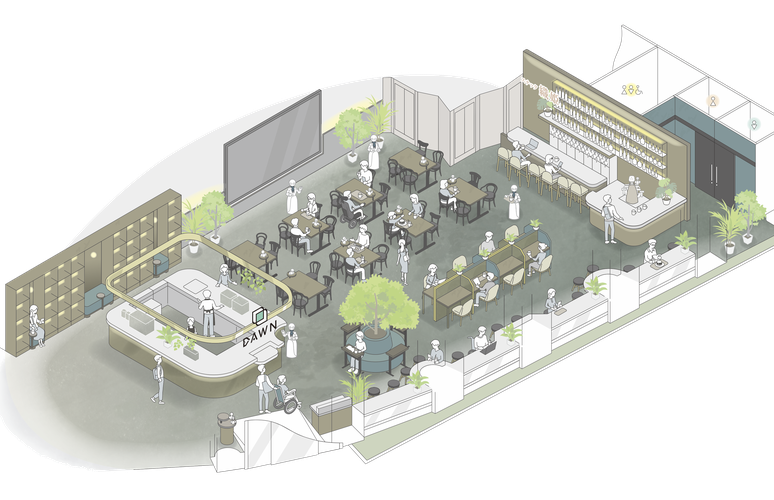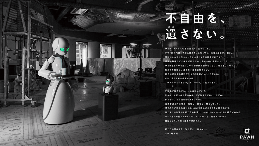 In addition to developing the avatar robots OriHime and OriHime-D, which users regardless of age, gender, or disability can remotely operate as their avatar, Ory Laboratory has envisioned the DAWN Avatar Robot Café concept, where users work or virtually visit via robots. Through our company's Avatar Guild remote staffing agency, users can seek employment, which provides a way for people to remain active in society. The goal is to demonstrate that with the right tools, even people who have difficulties in moving about freely can participate in physical labor and customer service from the comfort of their homes via an avatar robot.