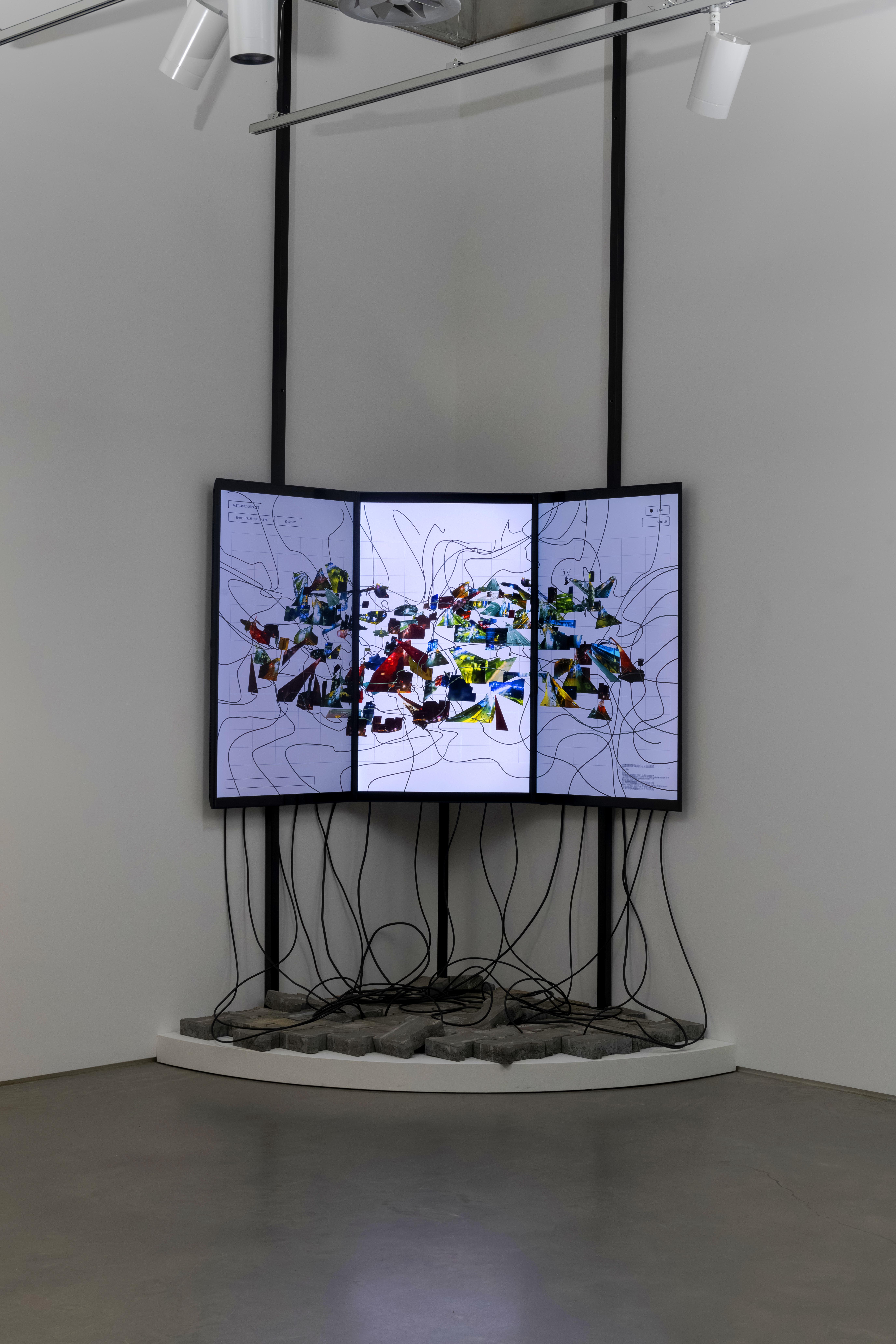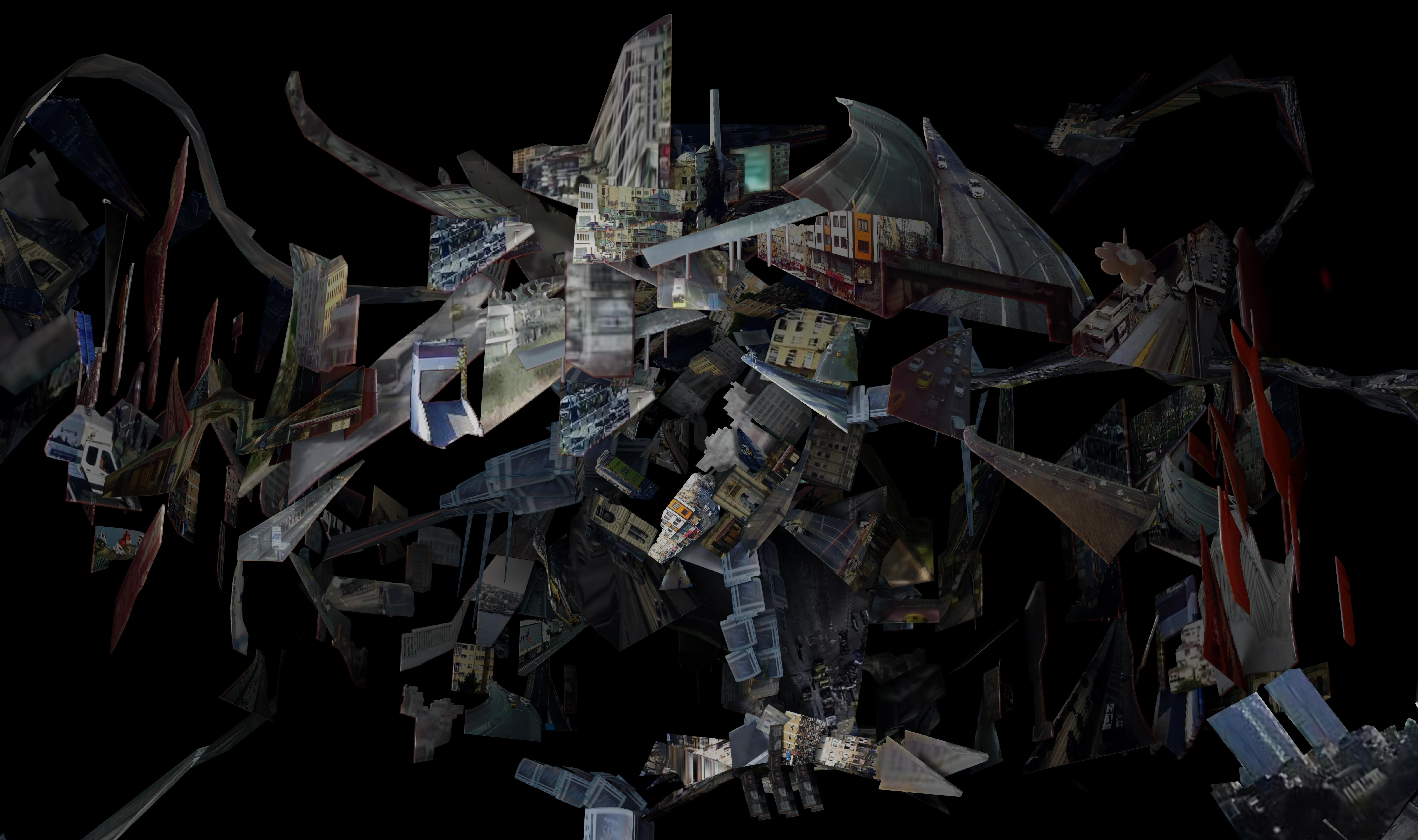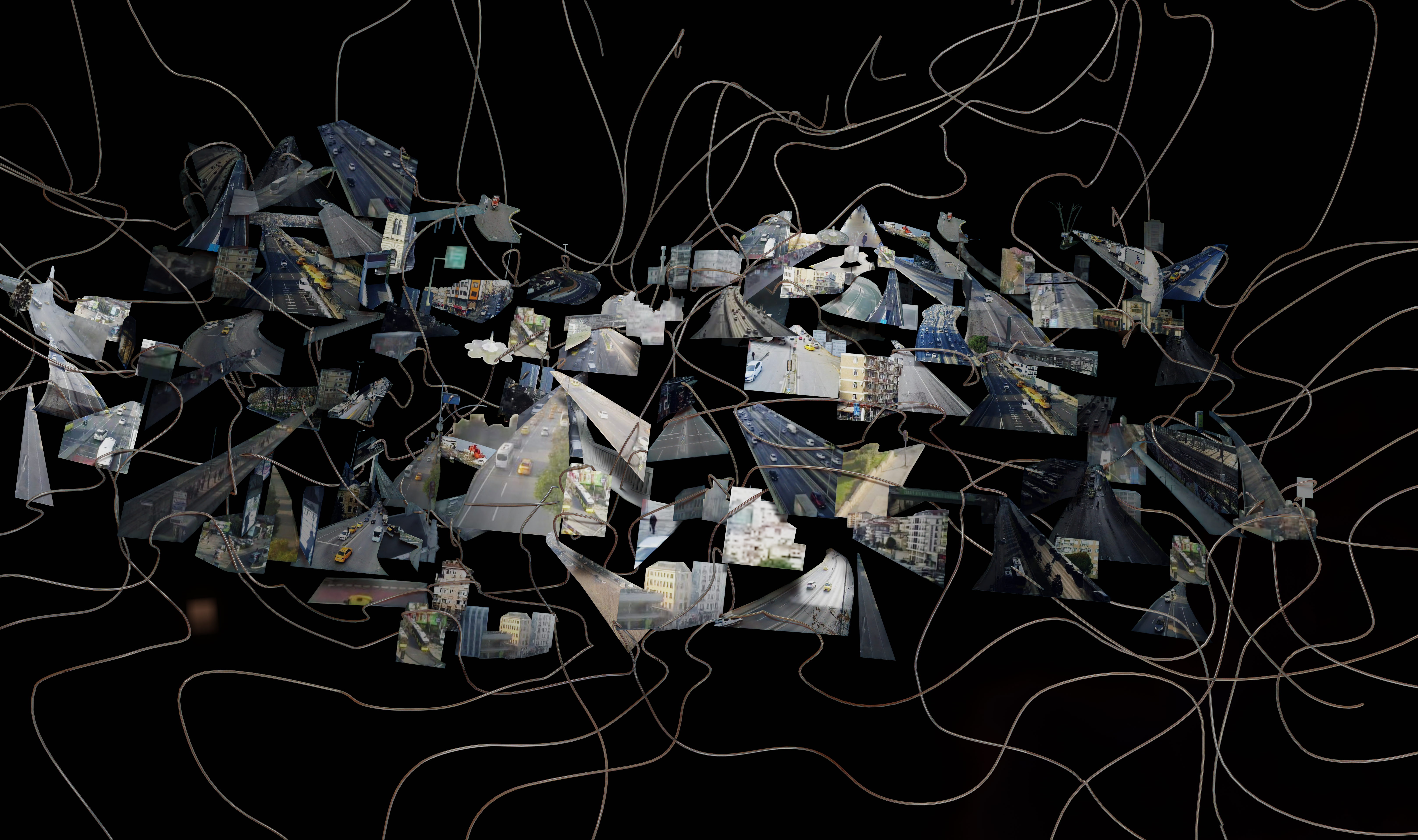 Coincidence is a real-time collage that uses video streams from fifty publicly accessible traffic and tourist live cameras scattered across the city of Istanbul. In contrast to the usual video surveillance, the intention of the work is not to observe, but to produce a social sculpture of Istanbul through a complex composite of moving images, imprinting in its visual density the political and ideological tensions of the city’s multicultural and cosmopolitan neighborhoods. Since the work is based in real time feeds, live cameras are subject to potential delays and errors. Hence, Coincidence uses a computationally efficient workflow and simple modular design using parallel processing, in which video frames are combined to generate a single texture, which is then converted into a movie file and finally transformed into 3D collages. All these processes are segmented and encapsulated into individual scripts to produce seamless 3D visualizations, creating a living urban sculpture. In the installation view of the artwork, cables are laid out with the intention to make evident the feeds of data that are required to make it work.