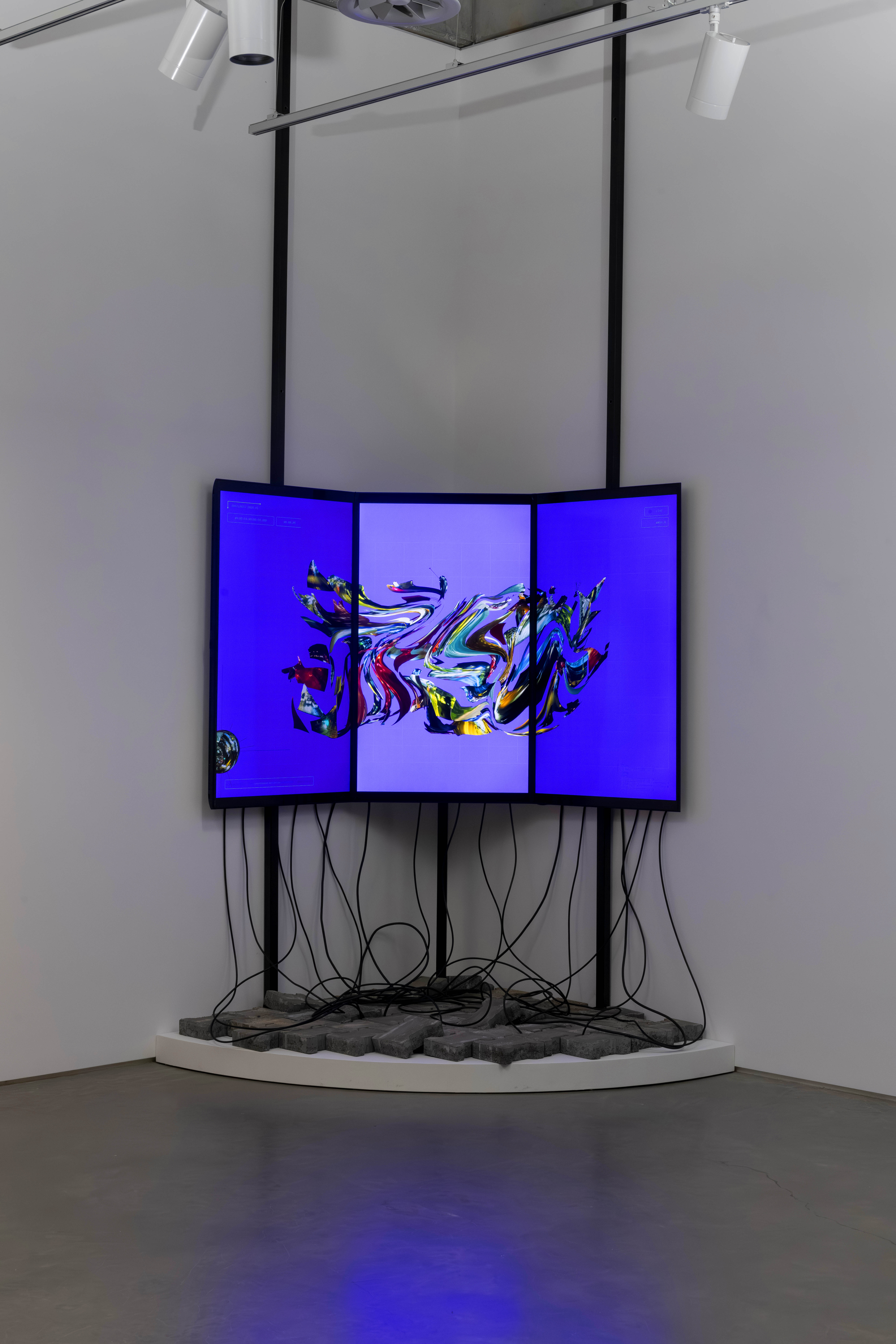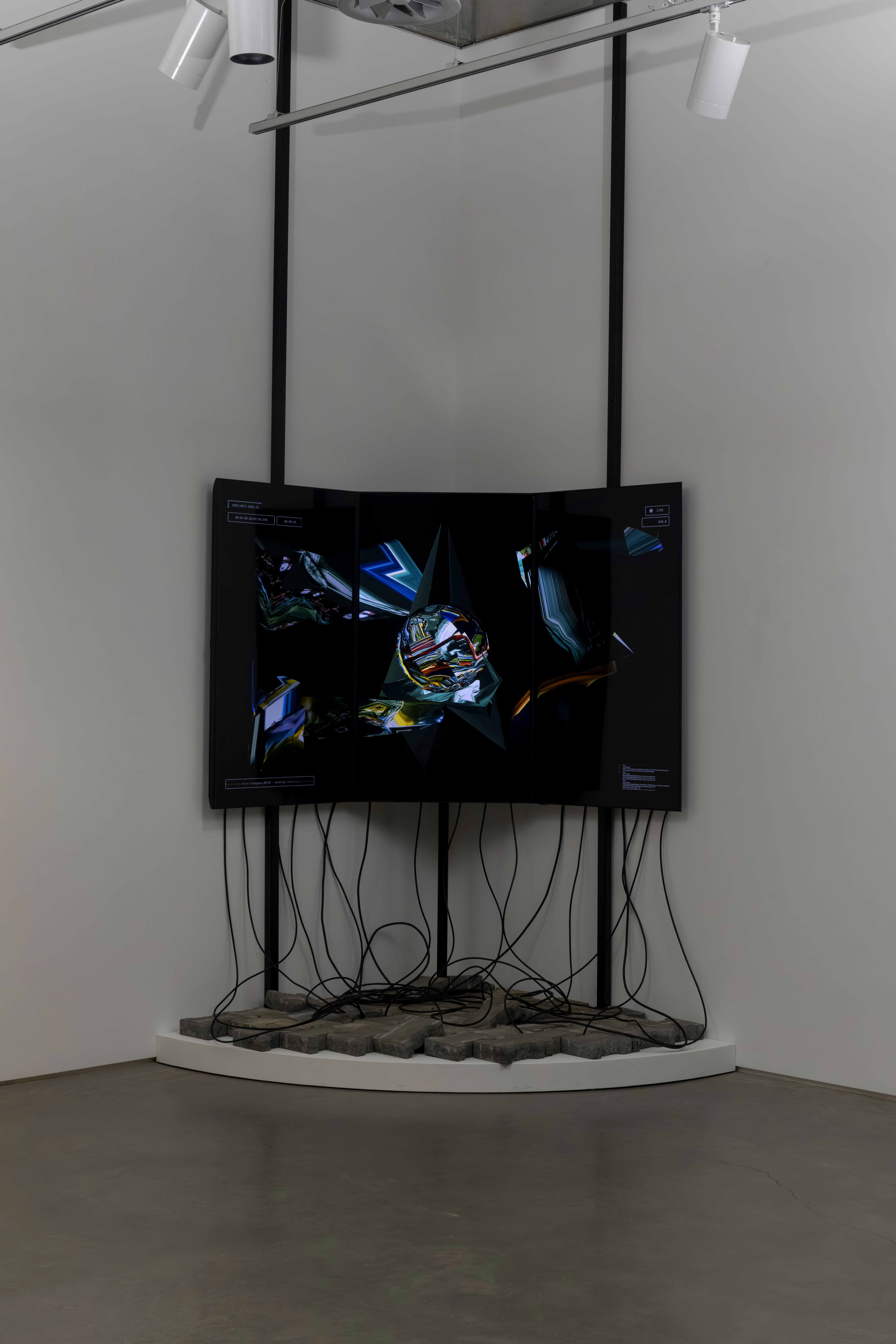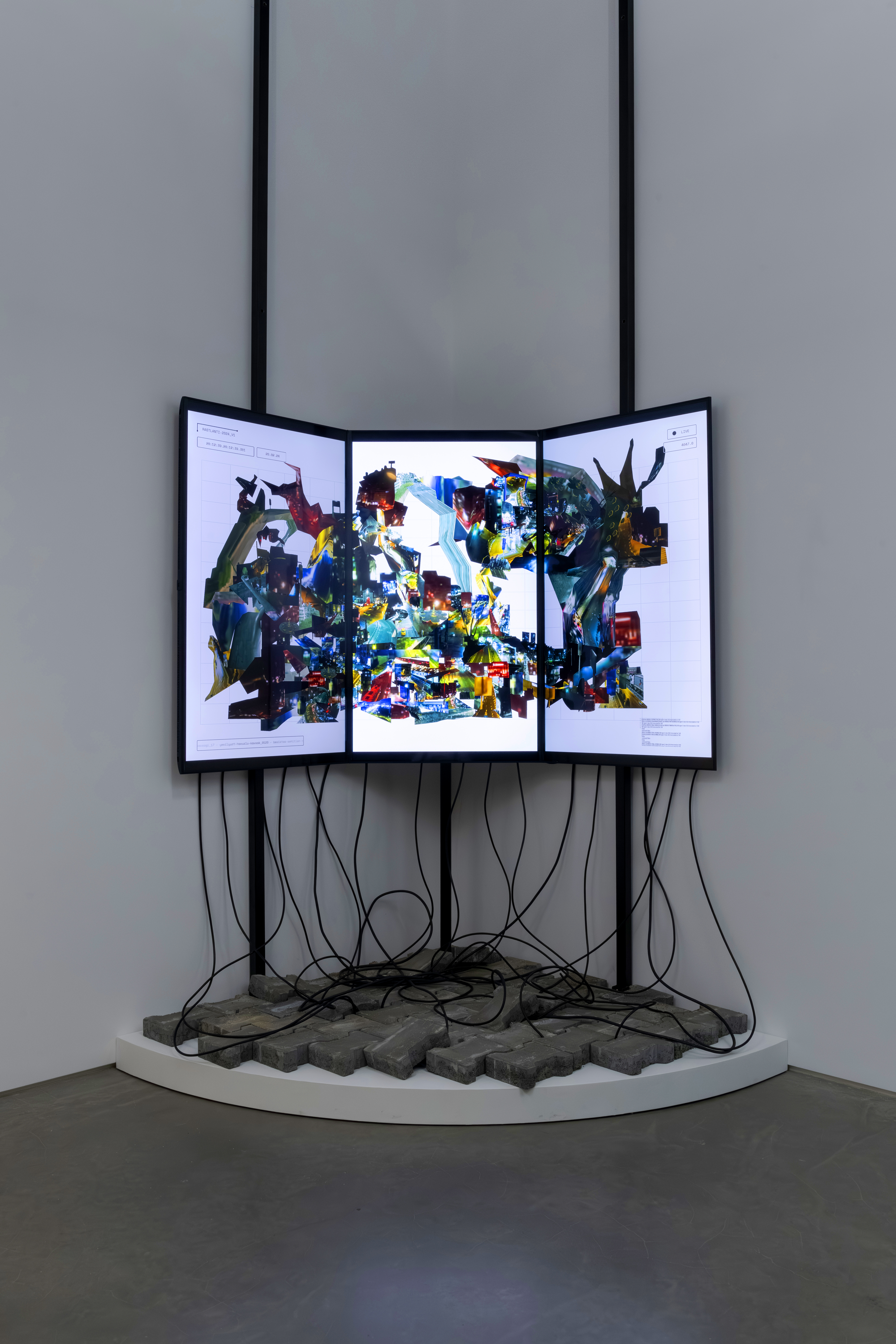 Coincidence is a real-time collage that uses video streams from fifty publicly accessible traffic and tourist live cameras scattered across the city of Istanbul. In contrast to the usual video surveillance, the intention of the work is not to observe, but to produce a social sculpture of Istanbul through a complex composite of moving images, imprinting in its visual density the political and ideological tensions of the city’s multicultural and cosmopolitan neighborhoods. Since the work is based in real time feeds, live cameras are subject to potential delays and errors. Hence, Coincidence uses a computationally efficient workflow and simple modular design using parallel processing, in which video frames are combined to generate a single texture, which is then converted into a movie file and finally transformed into 3D collages. All these processes are segmented and encapsulated into individual scripts to produce seamless 3D visualizations, creating a living urban sculpture. In the installation view of the artwork, cables are laid out with the intention to make evident the feeds of data that are required to make it work.