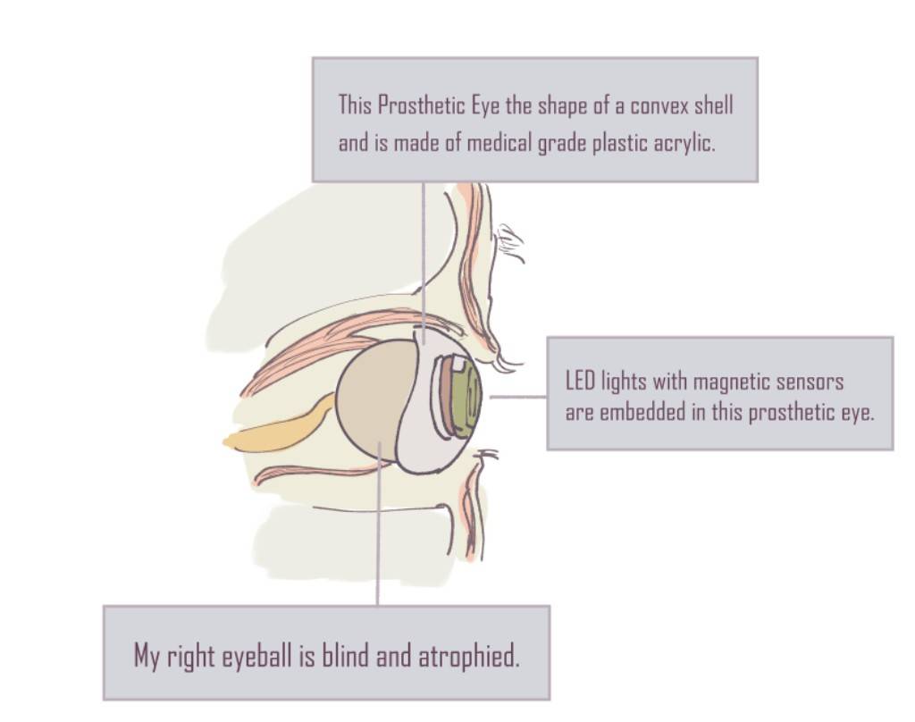 In Japan, prosthetic eyes have been designed to mimic real eyes. This seemingly rational approach is deeply rooted in the unique rules of Japan's prosthetic eye industry, also from the concept of prevailing societal norms. Given such a background , it has been impossible to realize individual wishes such as "I want a prosthetic eye with a slightly larger pupil to match my colored contact lens" or "I would like to have a prosthetic eye with blue irises", and officially approved prosthetic eye manufacturers have refused to produce such custom-made prosthetic eyes.