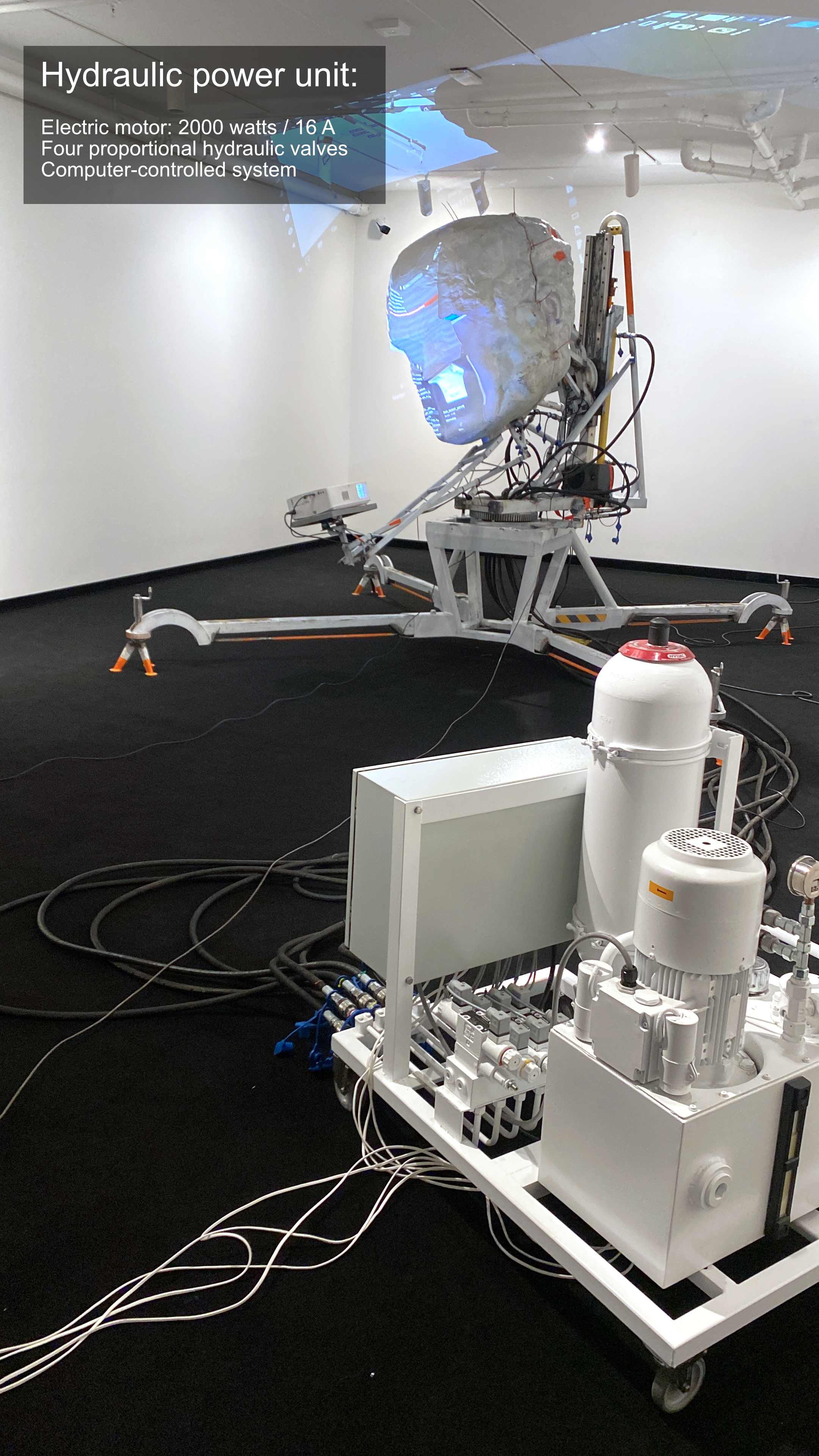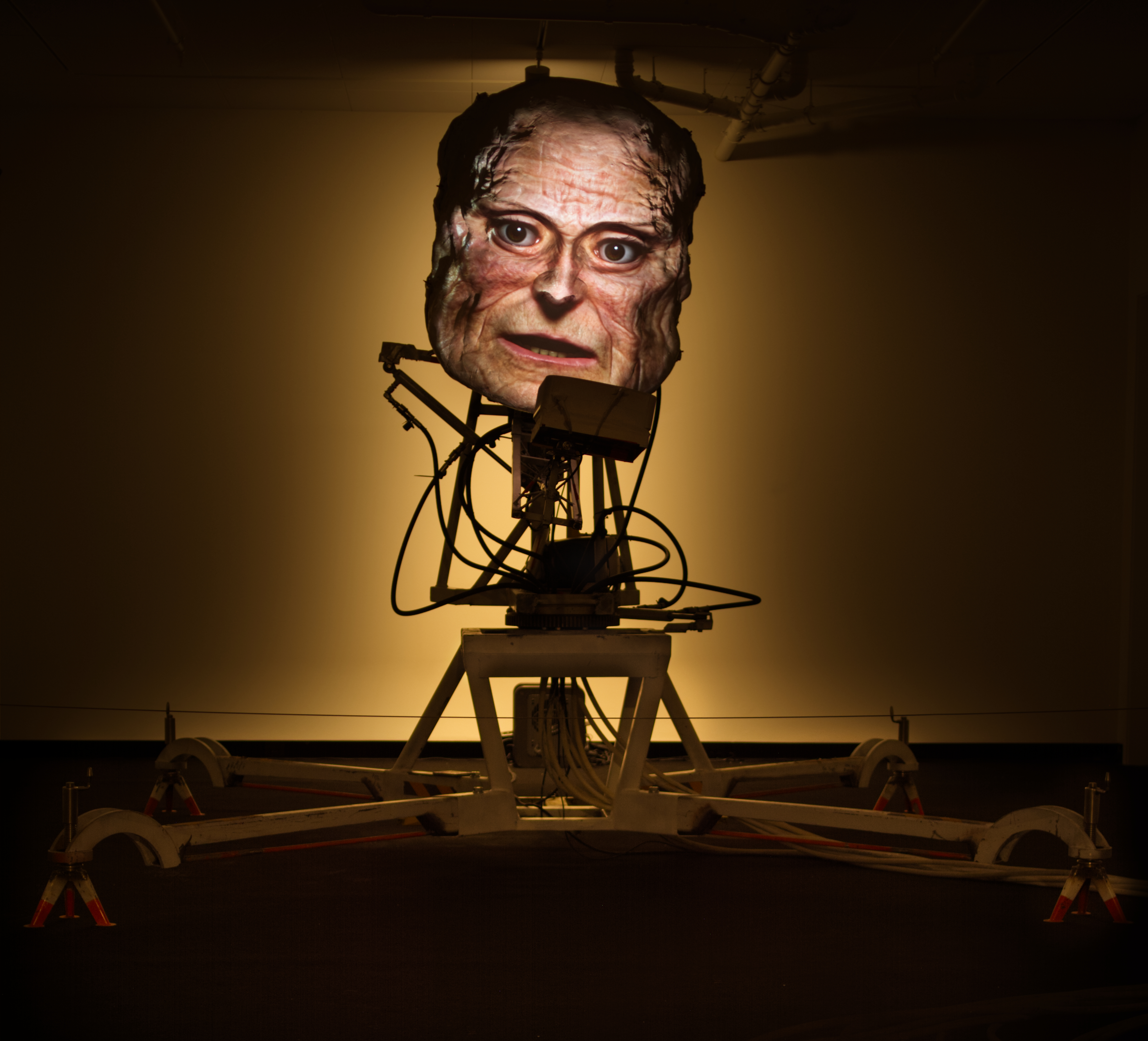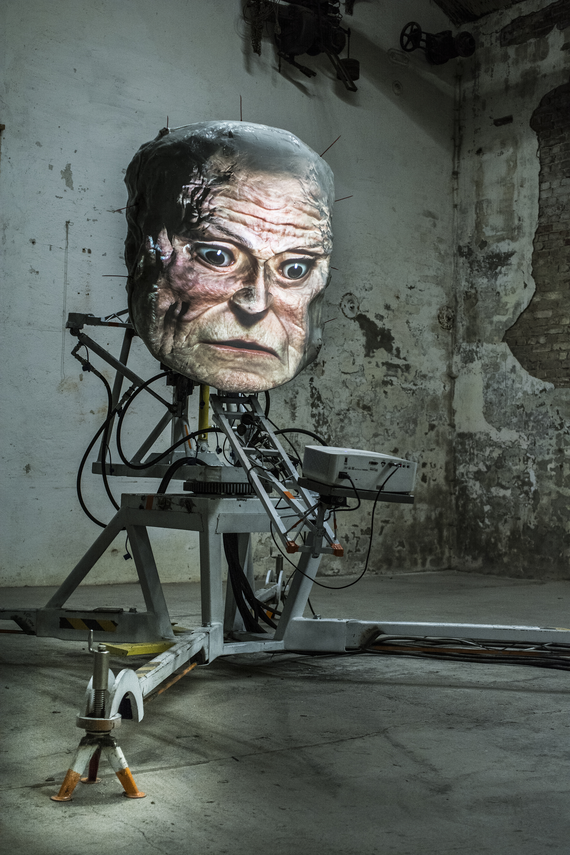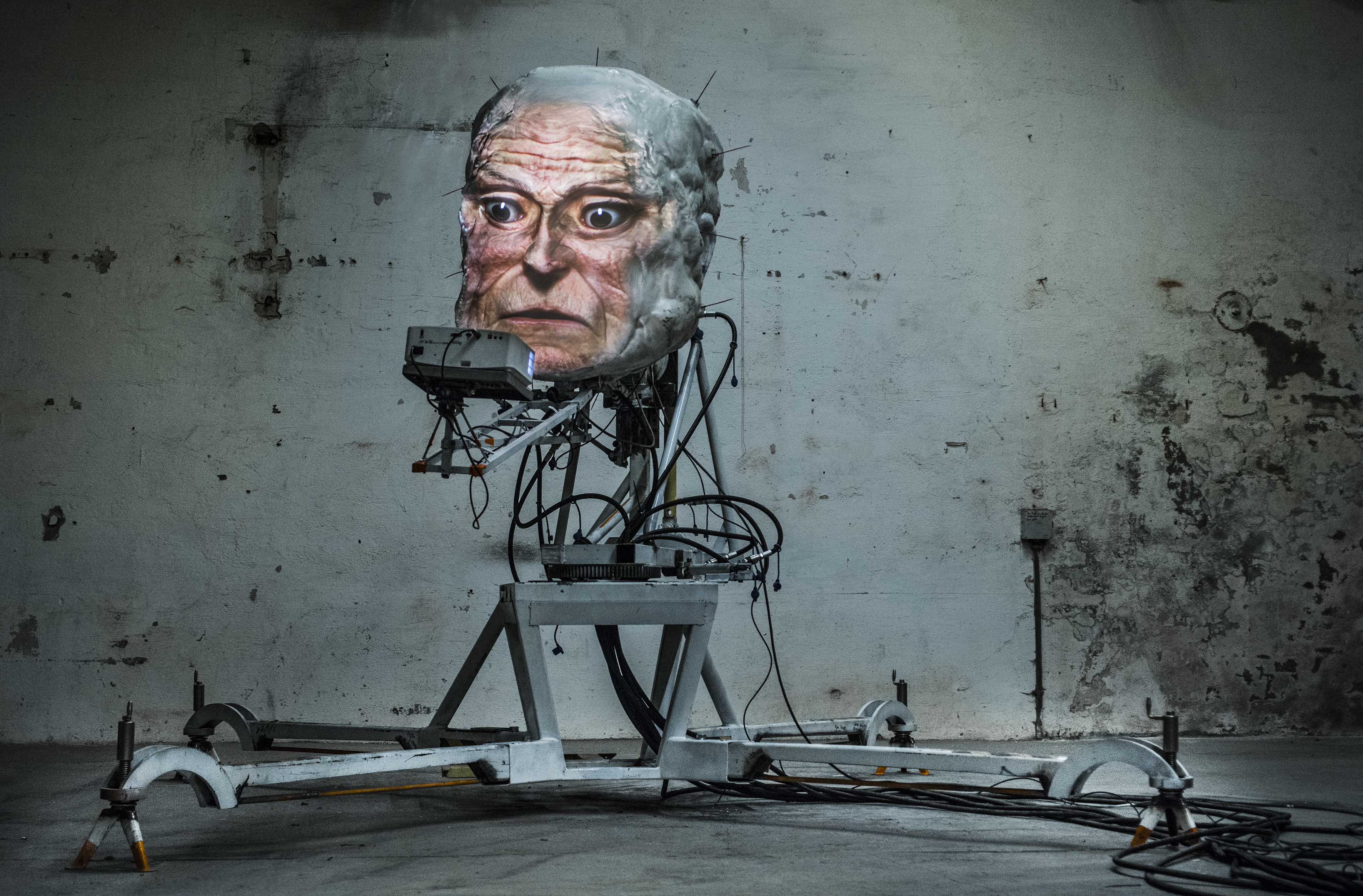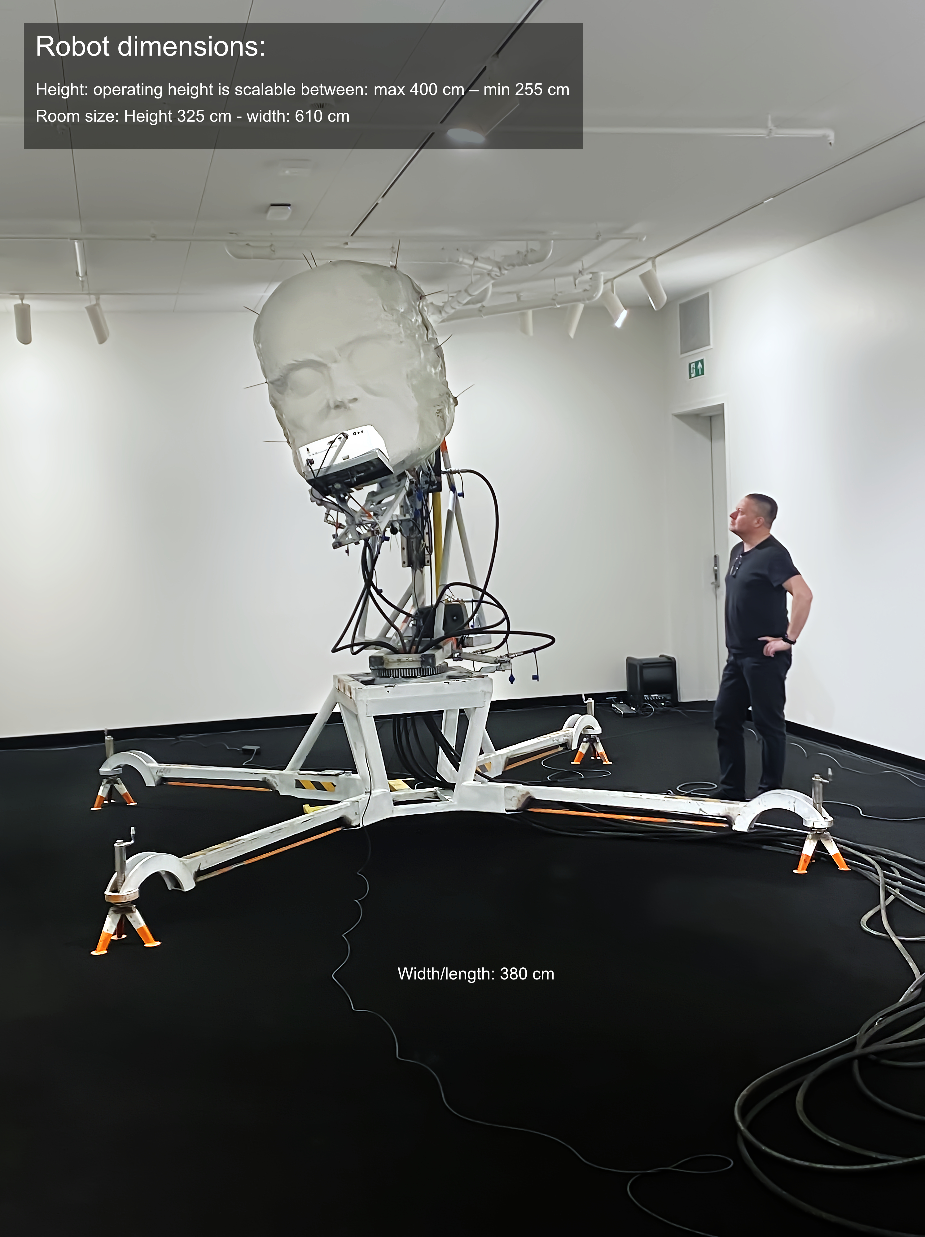 At the center of the installation stands a towering robotic figure, four meters tall—a skeletal construct of steel, hydraulics, and circuitry, locked in place, rigid and restrained. Its only means of expression are its voice and a slowly moving head. The towering body dominates the space, yet it is the face that captivates—drawing the viewer in. Digitally sculpted and animated with hyper-realistic detail, the face gives the robot its unsettling presence. Like the demagogues and prophets of history, it uses rhetoric as its only weapon.