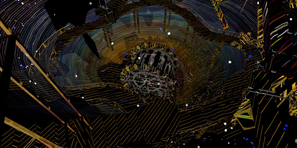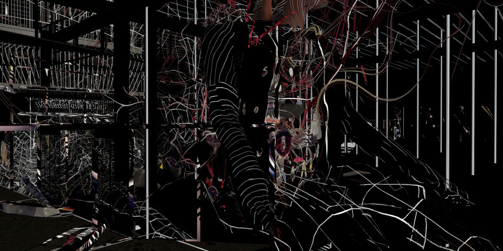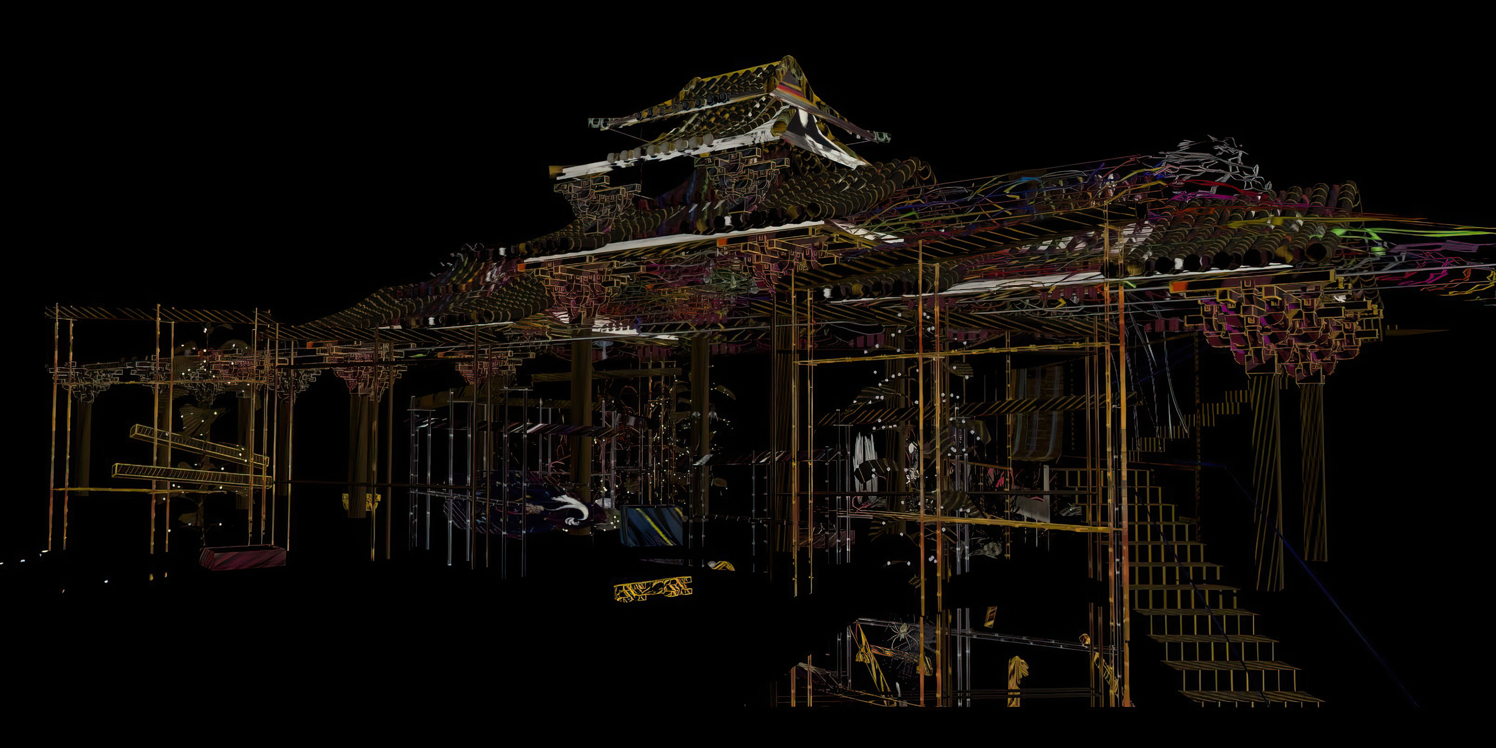 Ito Meikyū invites the viewer to immerse themselves in a large animated fresco. It presents a heterogeneous collection of drawn, animated and sound scenes, which are taken from the digital material. In a way, it recreates a subjective world (inner and outer world) in the form of a labyrinth composed of fractal architectures, inhabited by plants, objects, animals, men, women, patterns, and calligraphy. The spectator is invited to wander through this virtual space in a free way, letting themselves be guided by the chance of their discoveries.